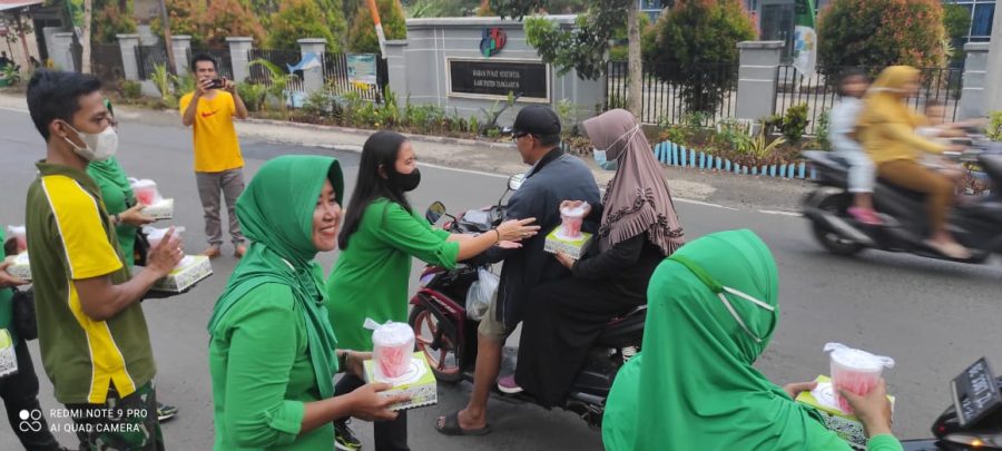 Ketua Persit Kartika Chandara Kirana Cabang XLVI Dim 0424/Tanggamus Ny. Risma Micha Arruan, SE,. M.M beserta para pengurusnya membagikan TakziL di Jalan Raya di depan Makodim 0424/Tanggamus Jl Ir H. Juanda Waysom Kec. Kota Agung. Jum,at (15/04).