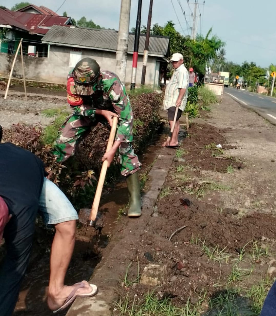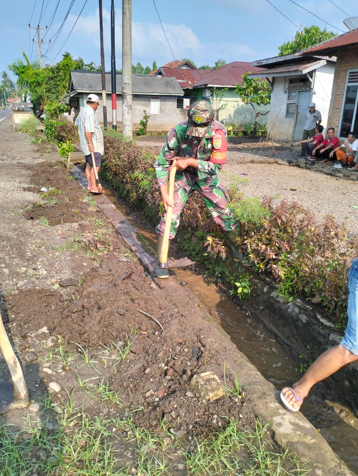 Sertu Hayubi menuturkan ,” kami bersama masyarakat Desa binaan melaksanakan aksi bersih atau gotong-royong untuk membersihkan parit dari rumput liar dan sampah, tujuan dari pembersihan parit tiada lain untuk memperlancar aliran air agar tidak terjadi banjir pada saat hujan tiba.