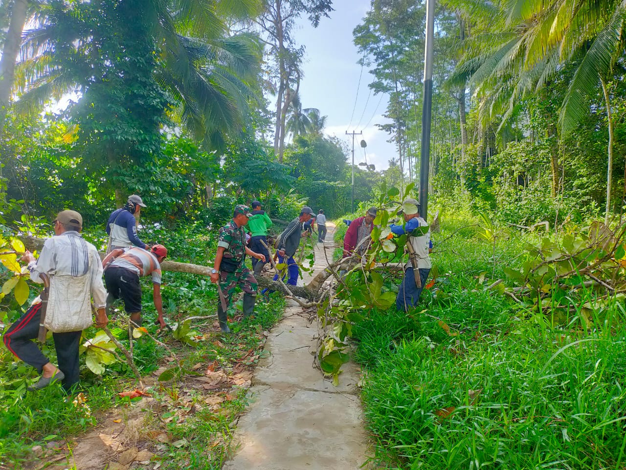 Kondisi cuaca yang tidak menentu dan sering terjadi hujan disertai angin kencang menimbulkan banyak kerawanan, terutama pohon tumbang. Mengantisipasi hal tersebut, Babinsa bersama warga bergotong-royong menebang pohon di pinggir jalan, sebab dikhawatirkan dapat membahayakan pengguna jalan.