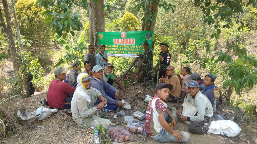 WS Danramil 424-08/Pulaupanggung Letda Inf Yuli Sitorus melaksanakan sosialisasi bahaya kebakaran Karhutlah kepada masyarakat Dusun Limau Kapas, Pekon Talang Jawa, Kec Pulaupanggung, Kab. Tanggamus, Selasa (31/10/2023).
