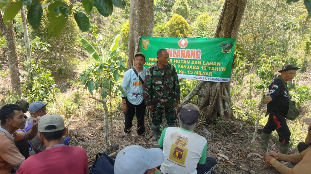 WS Danramil 424-08/Pulaupanggung Letda Inf Yuli Sitorus melaksanakan sosialisasi bahaya kebakaran Karhutlah kepada masyarakat Dusun Limau Kapas, Pekon Talang Jawa, Kec Pulaupanggung, Kab. Tanggamus, Selasa (31/10/2023).