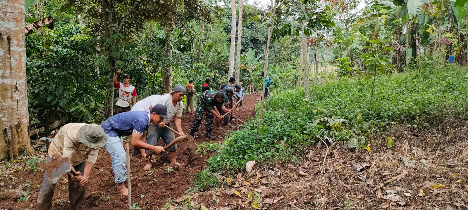 Babinsa 424-01/Cukuhbalak Kodim 0424/Tanggamus Serda Indra Gotongroyong Bersama Warga Binaannya membuka jalan penghubung di dusun Pangandaran d Pekon Kubulangka Kec. Cukubalak Kab.Tanggamus. Minggu (4/2/24).