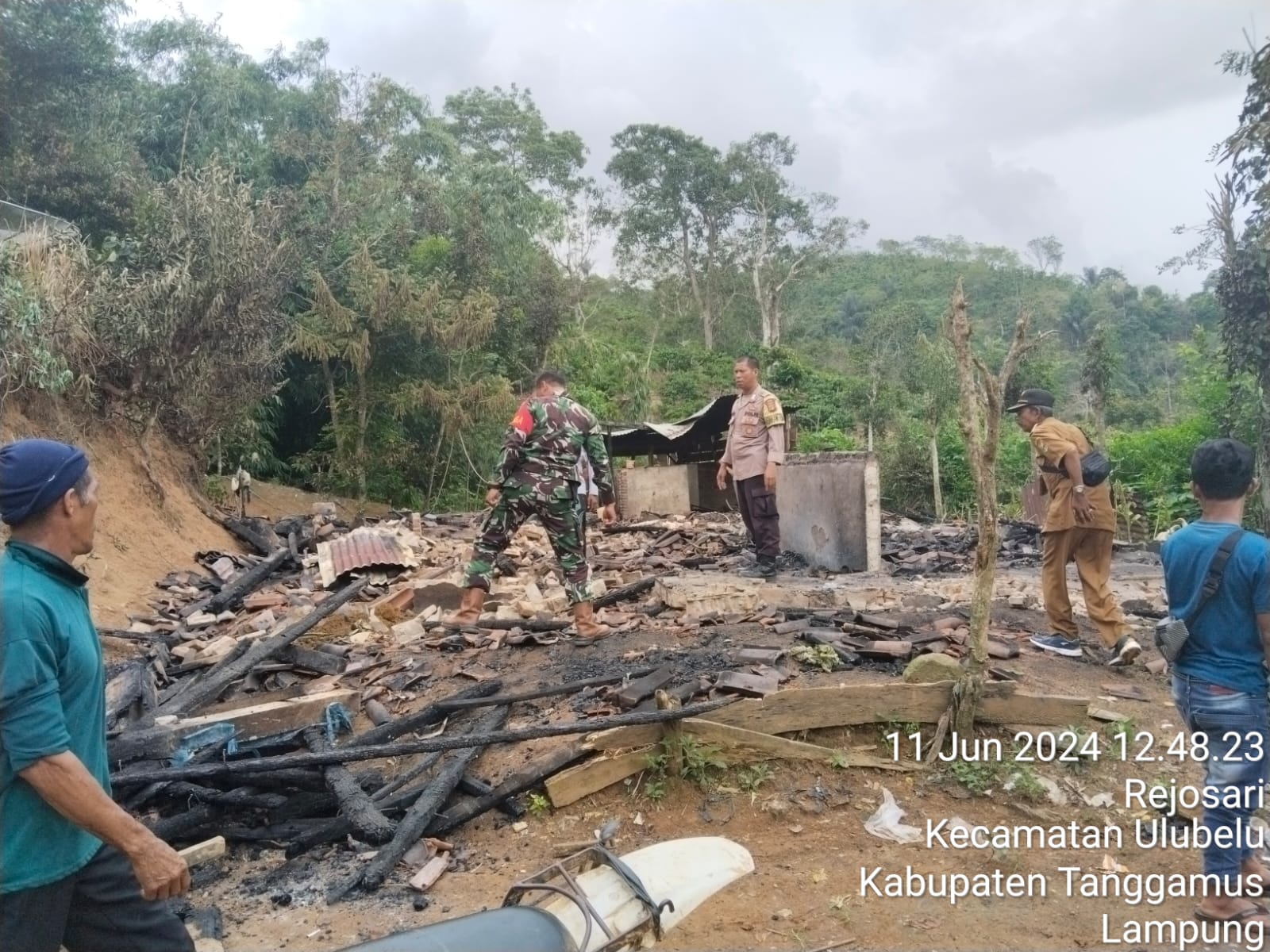 Babinsa Koramil 08/Pulau Panggung Serda Syeh Maulana turut bantu Evakuasi Korban Kebakaran Rumah Warga di Pekon Petay Kayu Kec. Ulu Belu Kab. Tanggamus. Senin (11/06/24).