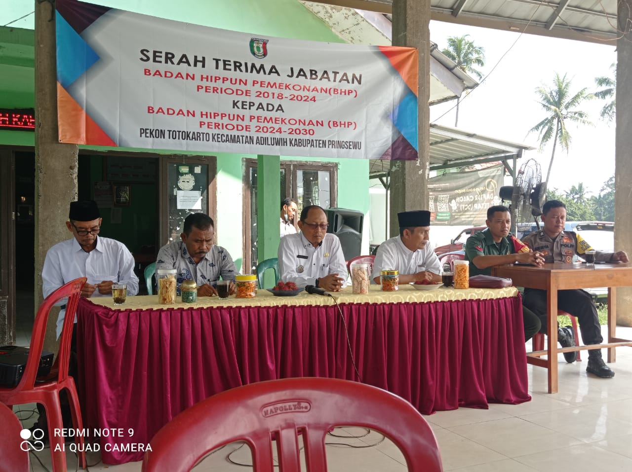 Babinsa Koramil 09/Sukoharjo Koptu Juned mewakili Danramil menghadiri undangan serah terima jabatan Ketua BHP (Badan Hippun Pemekonan) BHP di Pekon Totokarto kec.Adiluwih kec. Pringsewu. Kamis (18/4/2024).