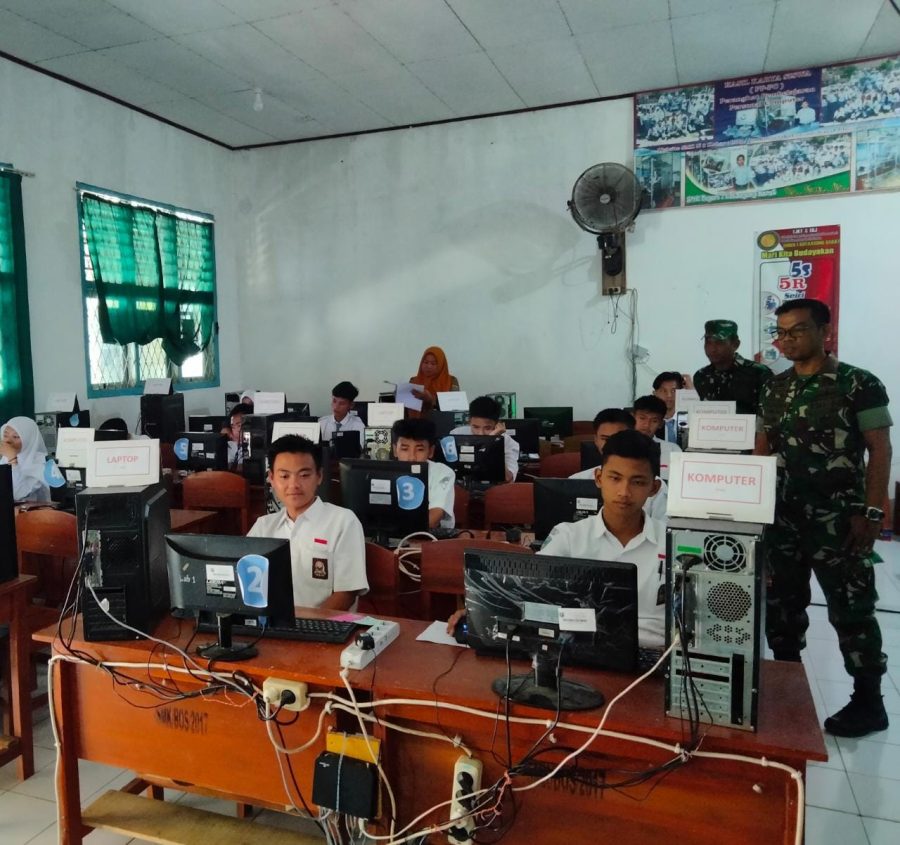 Dalam rangka mendukung perkembangan pendidikan di wilayah binaannya, Babinsa Koramil 424-03/Kota Agung Sertu Ahmad Irwandi dan Serda Suhendra membantu pengawasan ujian PKK di SMK N 1 Kota Agung Barat.