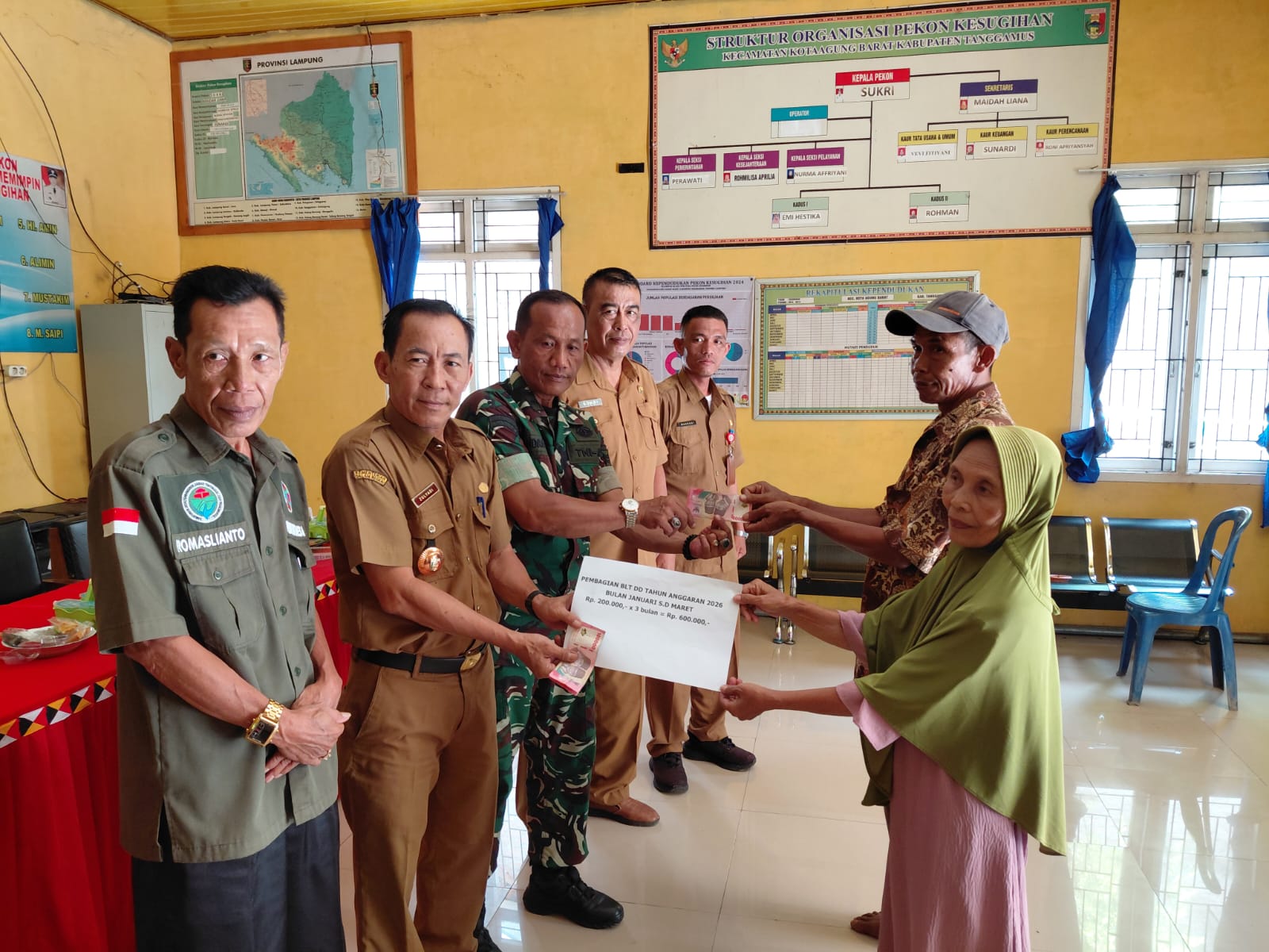 Tanggamus – Babinsa Koramil 424-03/Kota Agung, Pelda Hendrawan, menghadiri sekaligus melaksanakan pendampingan kegiatan pembagian Bantuan Langsung Tunai Dana Desa (BLT-DD) tahap I Tahun Anggaran 2026 di Pekon Pejajaran, Kecamatan Kota Agung Barat, Kabupaten Tanggamus, Selasa (07/04/2026).