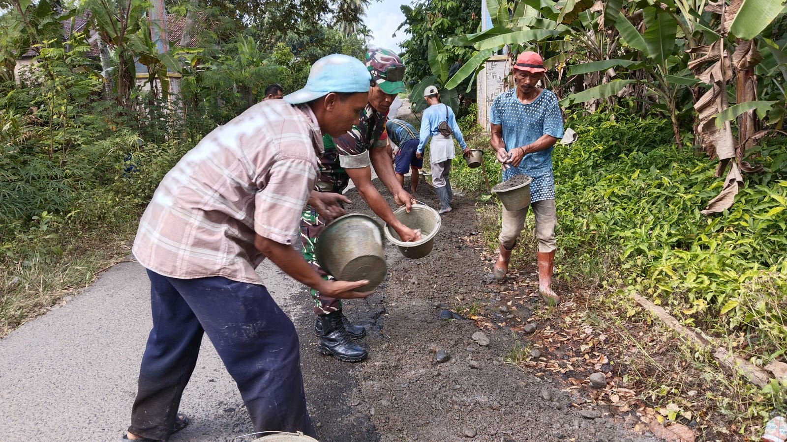 Babinsa Koramil 424 – 03/ Kota Agung, Sertu Puji Sugito, melaksankan gotong royong bersama warga memperbaiki jalan kampung, bertempat di pekon Terdana, Kec. Kota Agung, Kab. Tanggamus. Jum’at (21/06/2024).