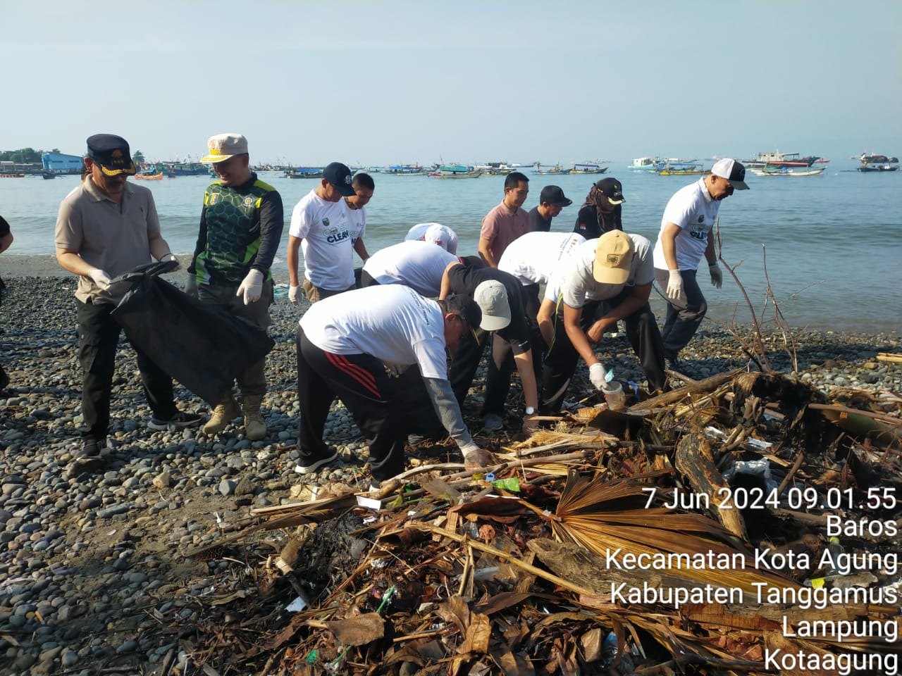 babinsa koramil 424-03/kotaagung peltu a.k. zailani menghadiri launching bank salingda (bank sampah keliling pemda) dan kegiatan coastal clean up dalam rangka hari lingkungan hidup sedunia di Pantai Muara Indah Kotaagung. Jum’at (07/06/24).