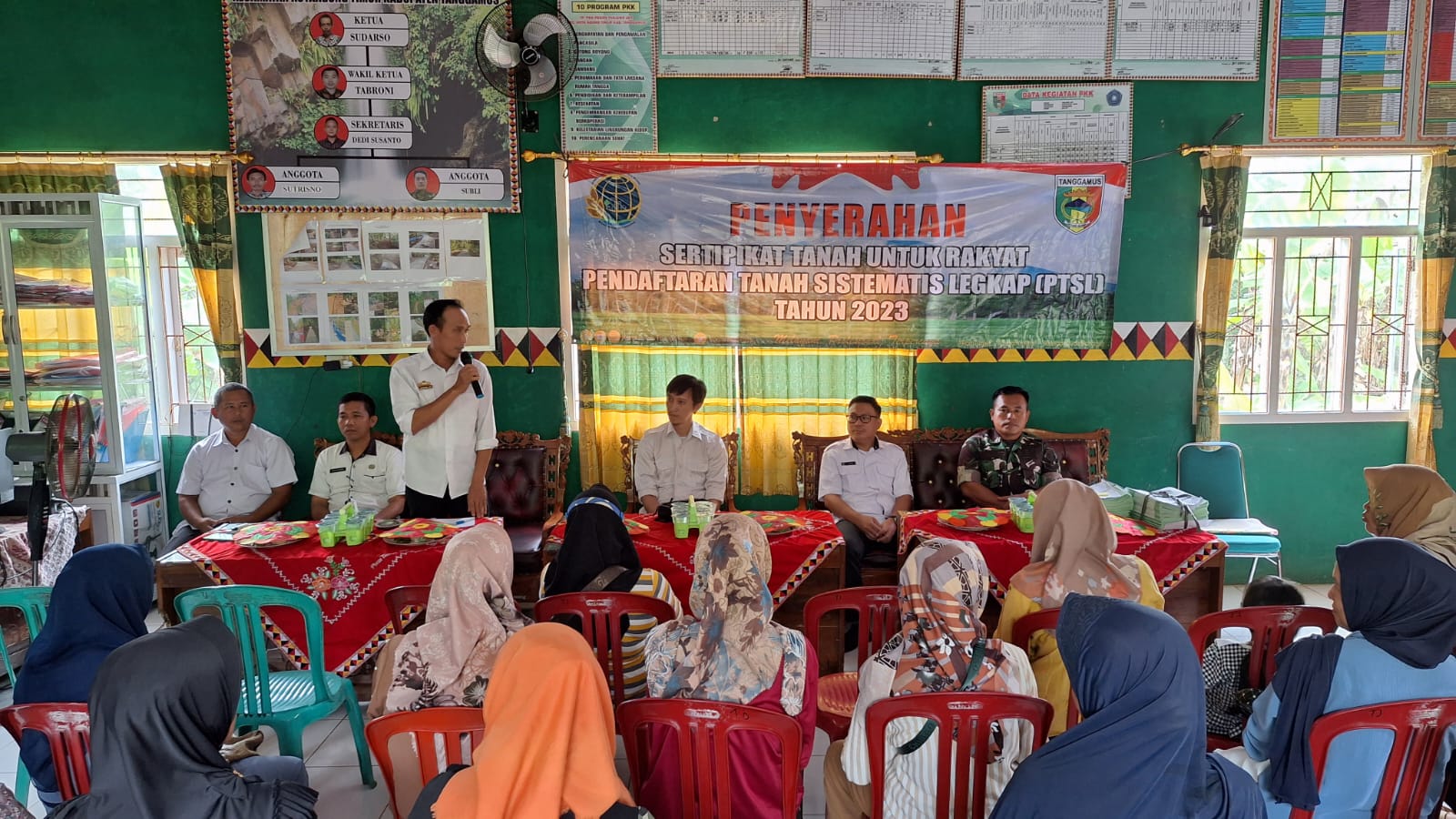 Babinsa Koramil 424-03/Kotaagung Sertu Agung Pribadi menghadiri kegiatan penyerahan Sertifikat Program Nasional Pendaftaran Tanah Sistematis Lengkap (PTSL) oleh tim pertanahan Kab. Tanggamus di Pekon Tanjung Jati, Kec. Kotaagung timur, Kab. Tanggamus, Rabu (01/11/2023).