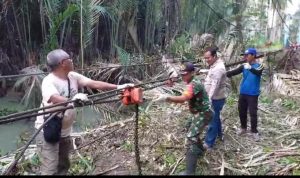 Babinsa Koramil 424-03/Kotaagung Kodim 0424/Tanggamus Sertu Imamuddin Ikut Gotong Royong dalam pembangun Jembatan Gantung di Pekon Tampang Tua Kecamatan Pematang Sawa, Kabupaten Tanggamus. Kamis (25/09/2025).