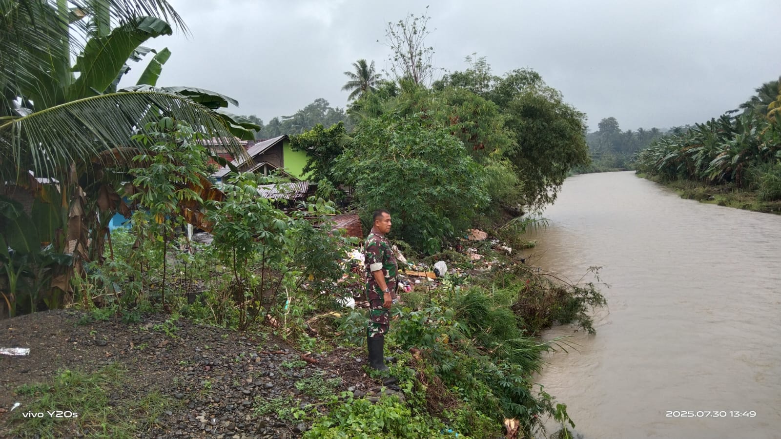 Antisipasi meluapnya air sungai, Babinsa Koramil 424-03/Kotaagung Sertu Saprudin aktif melakukan patroli rutin di sekitar Sungai untuk memantau ketinggian debit air guna mengantisipasi potensi bencana banjir, di Pekon Negara batin, Kec. Kotaagung Barat, Kab. Tanggamus, Minggu (03/08/2025).