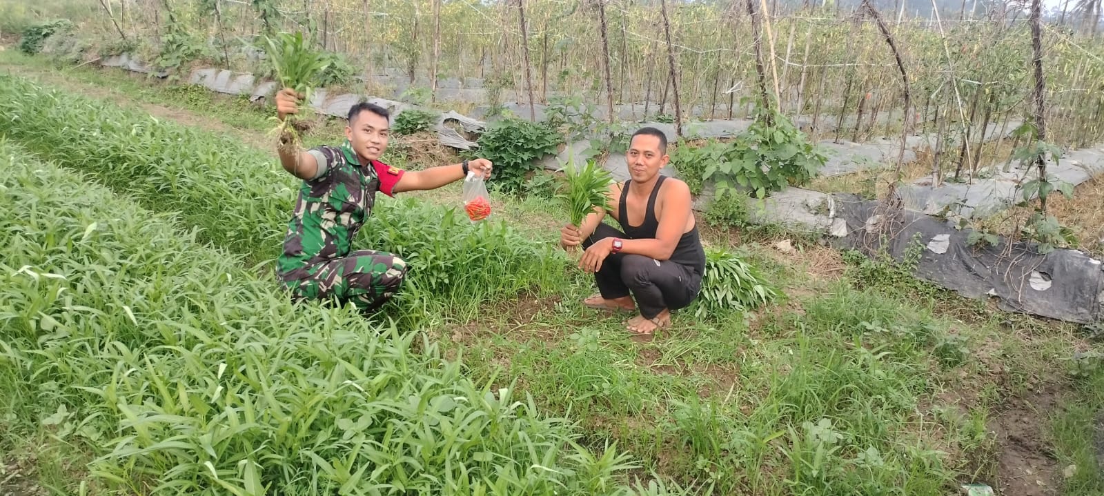Babinsa Koramil 424-04/Talang Padang Serka Medi membantu Petani memanen Sayuran di lahan milik bapak Nurdin, warga binaannya di Pekon Kedaloman, Kec. Gunung Alif, Kab. Tanggamus, Kamis (29/03/2024).