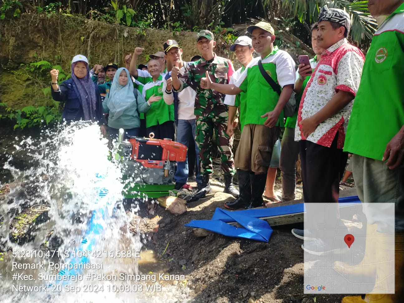 Babinsa Koramil 424 – 04/ Talang Padang, Serka Medi mengatakan, “hari ini kami Kec. Sumberjo, memasang dan menguji pompa air alhamdulillah berhasil”, ucap Babinsa.