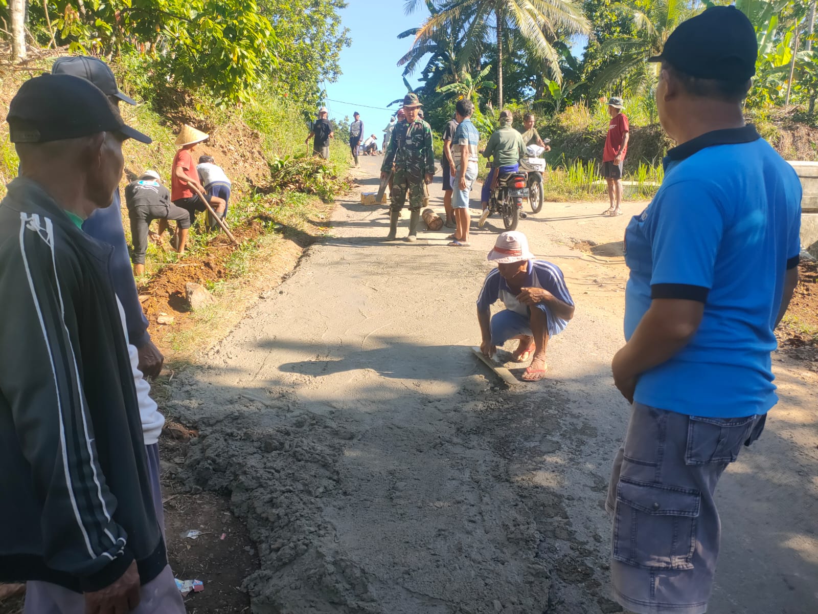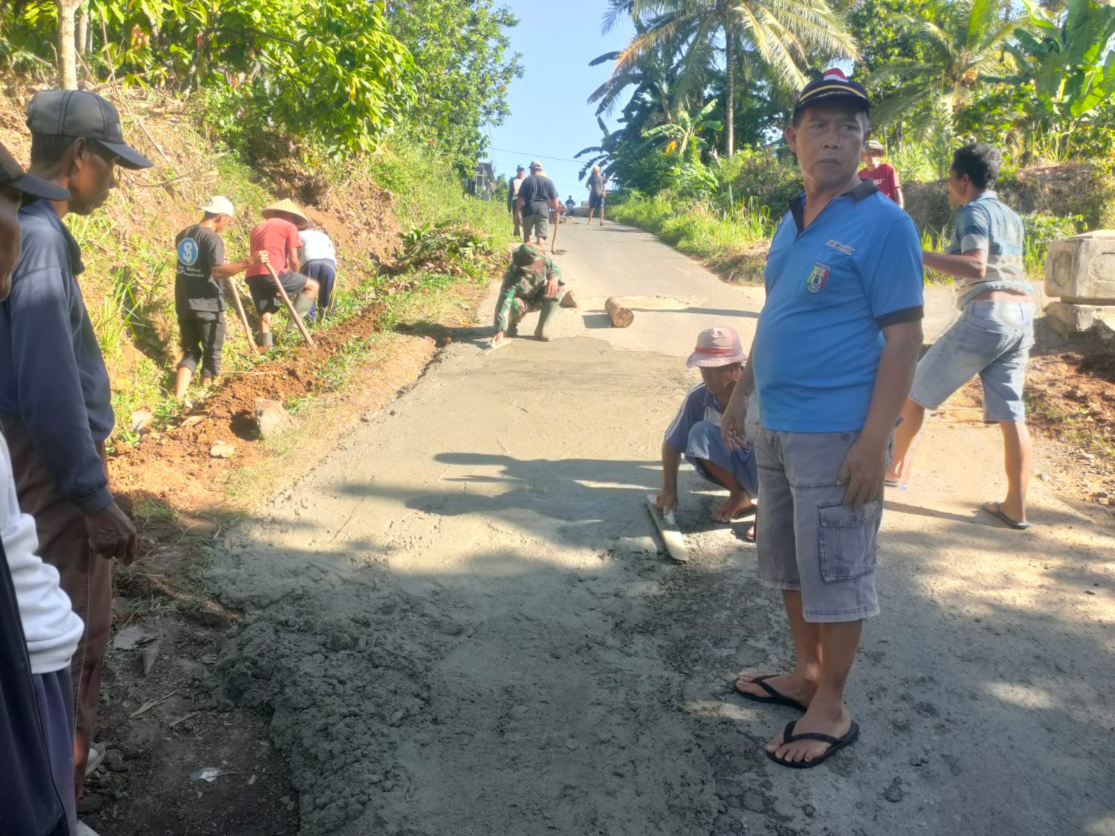 Pringsewu — Babinsa Koramil 424-05/Pagelaran Pelda Reno bersama warga melaksanakan kegiatan gotong royong perbaikan jalan melalui pengecoran semen di Pekon Panutan, Kecamatan Pagelaran, Kabupaten Pringsewu, Minggu (30/11/2025).