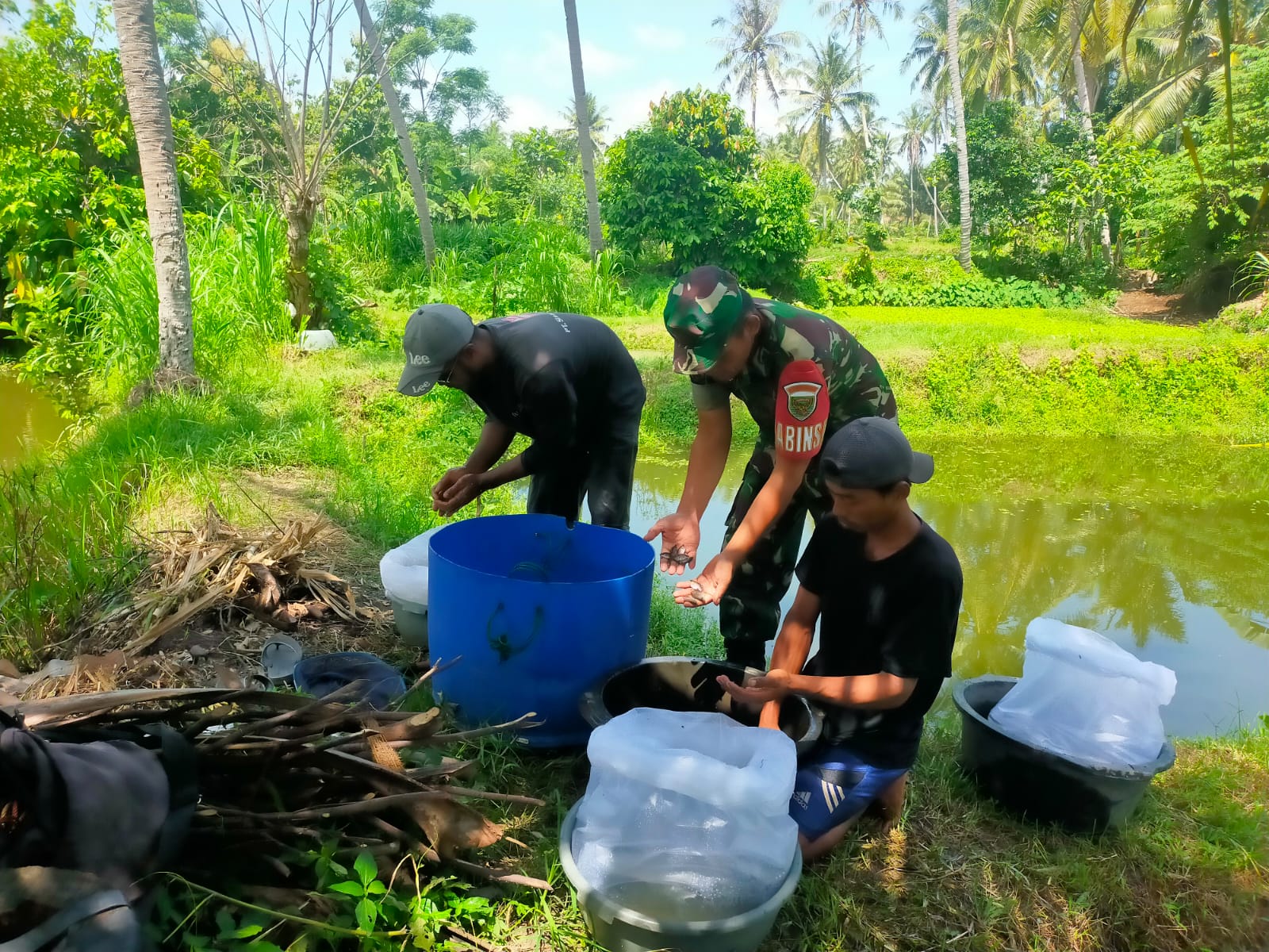 Dalam mendukung program pemerintah terkait dengan peningkatan ketahan pangan, Babinsa Serka Sarino anggota Koramil 424-05/Pagelaran mendampingi warga binaan budidaya ternak ikan nila milik Bapak Wagino warga Pekon Karangsari, Kec. Pagelaran, Kab. Pringsewu, Rabu (02/10/2024).