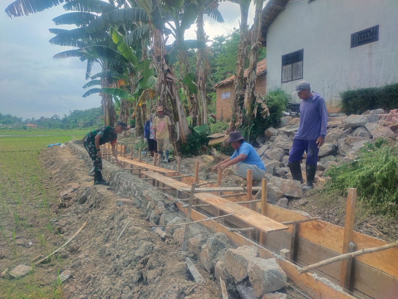 Babinsa Koramil 424-06/Pringsewu, Serda April Santoso, melaksanakan kegiatan gotong royong bersama warga binaan dalam pembangunan irigasi sawah di Kelurahan Pringsewu Timur, Kecamatan Pringsewu, Kabupaten Pringsewu, pada Kamis (04/12/2025).