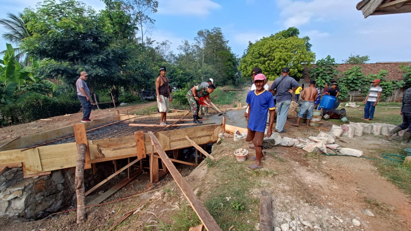 Guna terciptanya kebersamaan dan kemanunggalan TNI bersama rakyat, Babinsa Koramil 424-06/Pringsewu, Serda Tomi Edison bersama Masyarakat melaksanakan pengecoran jembatan di Pekon Rejosari, Kec. Pringsewu, Kab. Pringsewu, Kamis (21/12/2023).