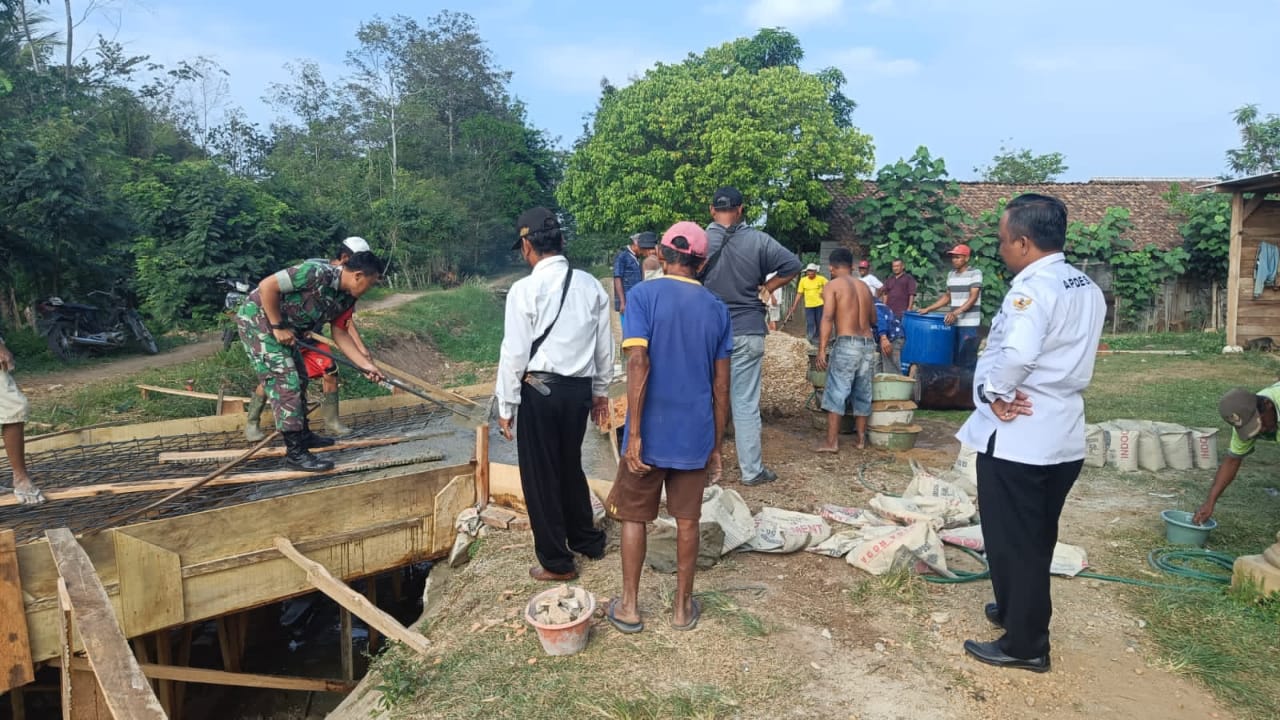 Guna terciptanya kebersamaan dan kemanunggalan TNI bersama rakyat, Babinsa Koramil 424-06/Pringsewu, Serda Tomi Edison bersama Masyarakat melaksanakan pengecoran jembatan di Pekon Rejosari, Kec. Pringsewu, Kab. Pringsewu, Kamis (21/12/2023).