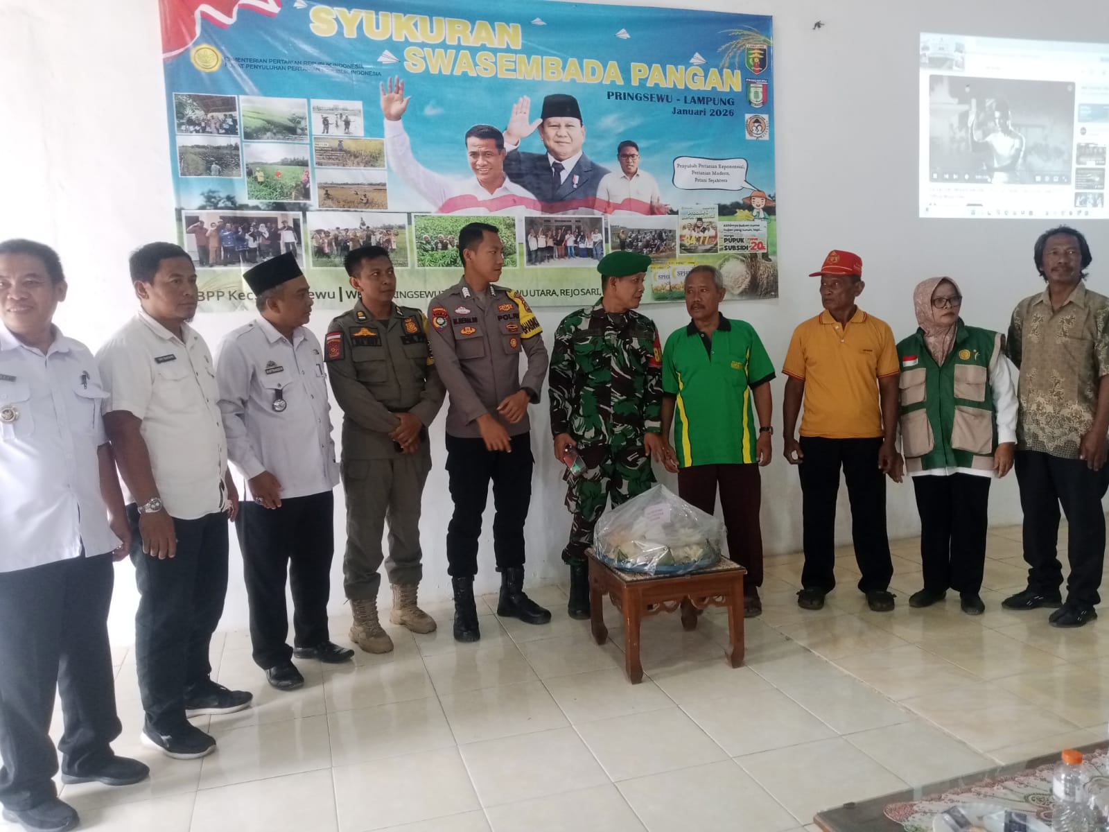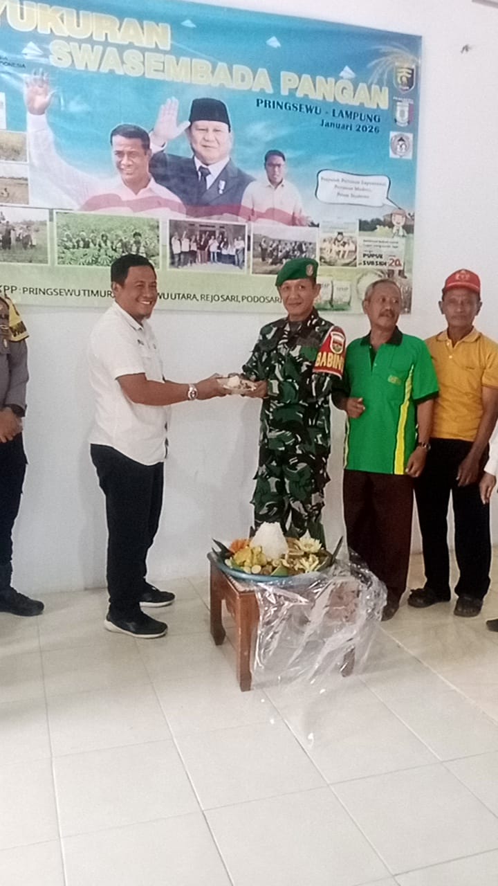 Babinsa Koramil 424-06/Pringsewu Sertu Anwari menghadiri kegiatan Syukuran Swasembada Pangan wilayah Pringsewu Timur, Pringsewu Utara, Rejosari dan Podosari yang dilaksanakan di Balai Pekon Rejosari, BPP Kecamatan Pringsewu, Rabu (07/01/2026).