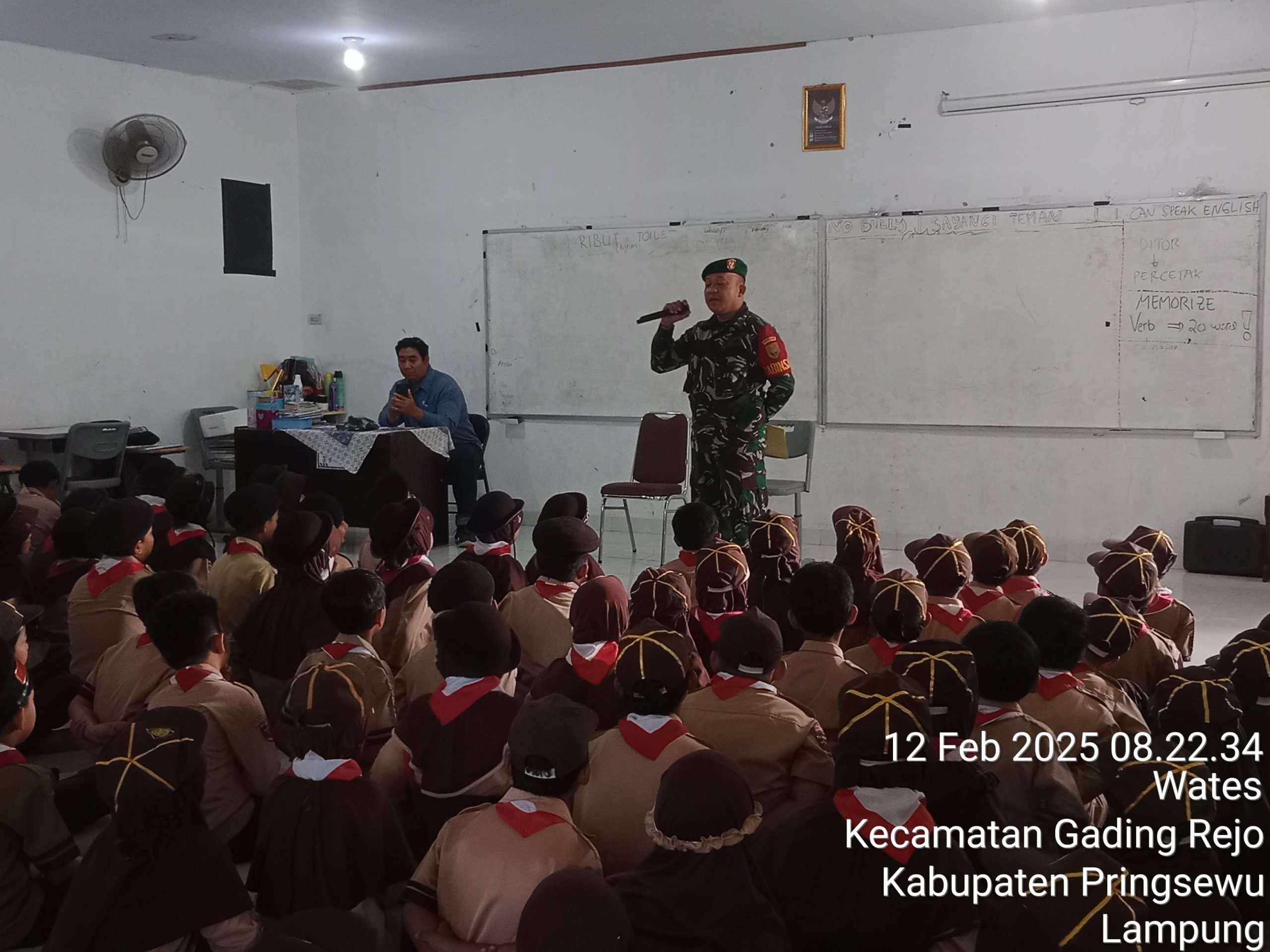 Babinsa Koramil 424-07/Gadingrejo Serda Sugiharto memberikan materi wawasan kebangsaan kepada siswa Sekolah Dasar Citra Bangsa School di Pekon Bulukarto, Kec. Gadingrejo, Kab. Pringsewu, Rabu (12/02/2025).