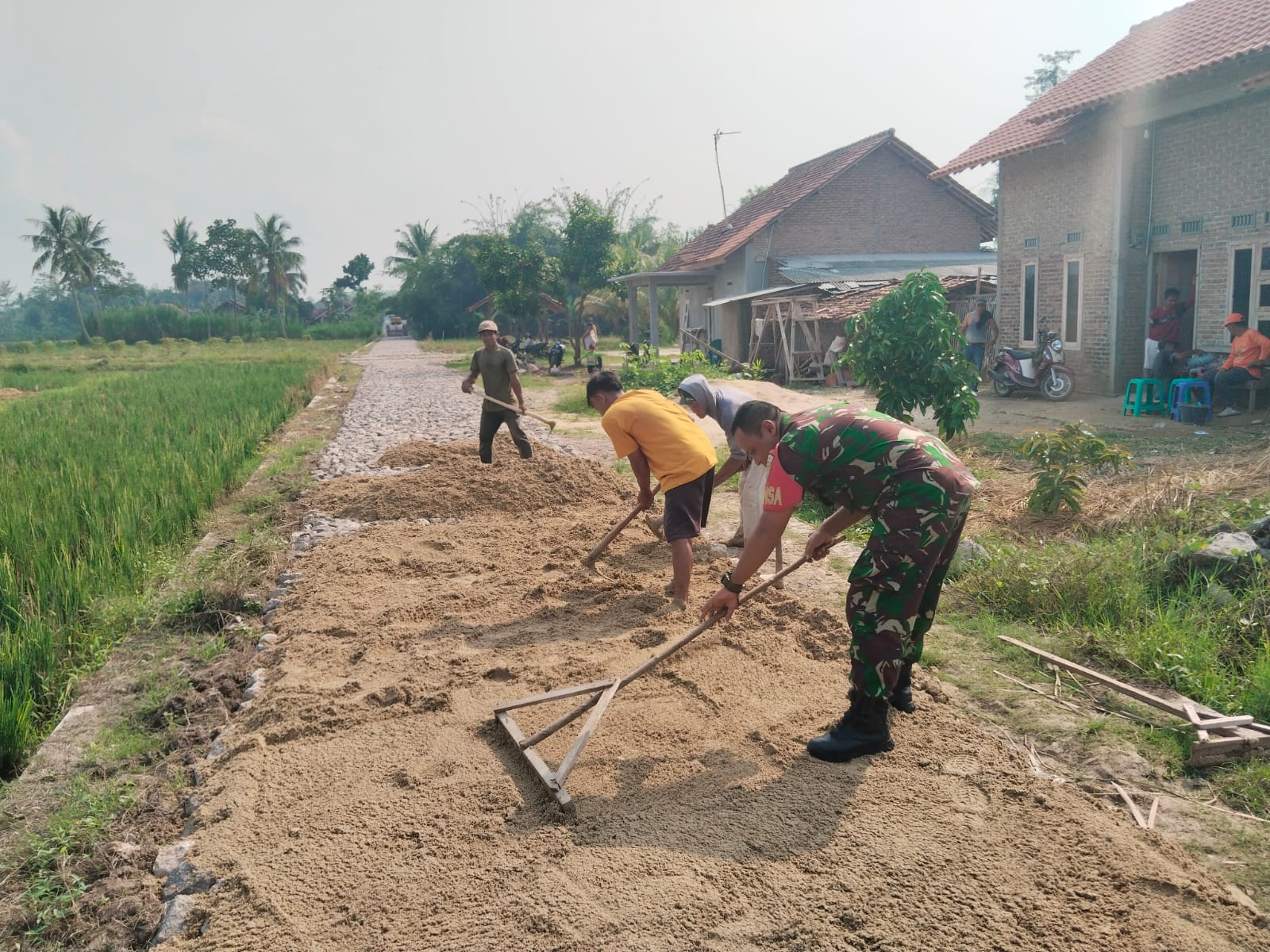 Babinsa Koramil 424-07/Gadingrejo Peltu Hepi Fajar ikut bergotong royong bersama warga meratakan timbunan pasir di Jalan Dusun 3, Pekon Tegal Sari, Kec. Gadingrejo, Kab. Pringsewu, Sabtu (08/06/2024).