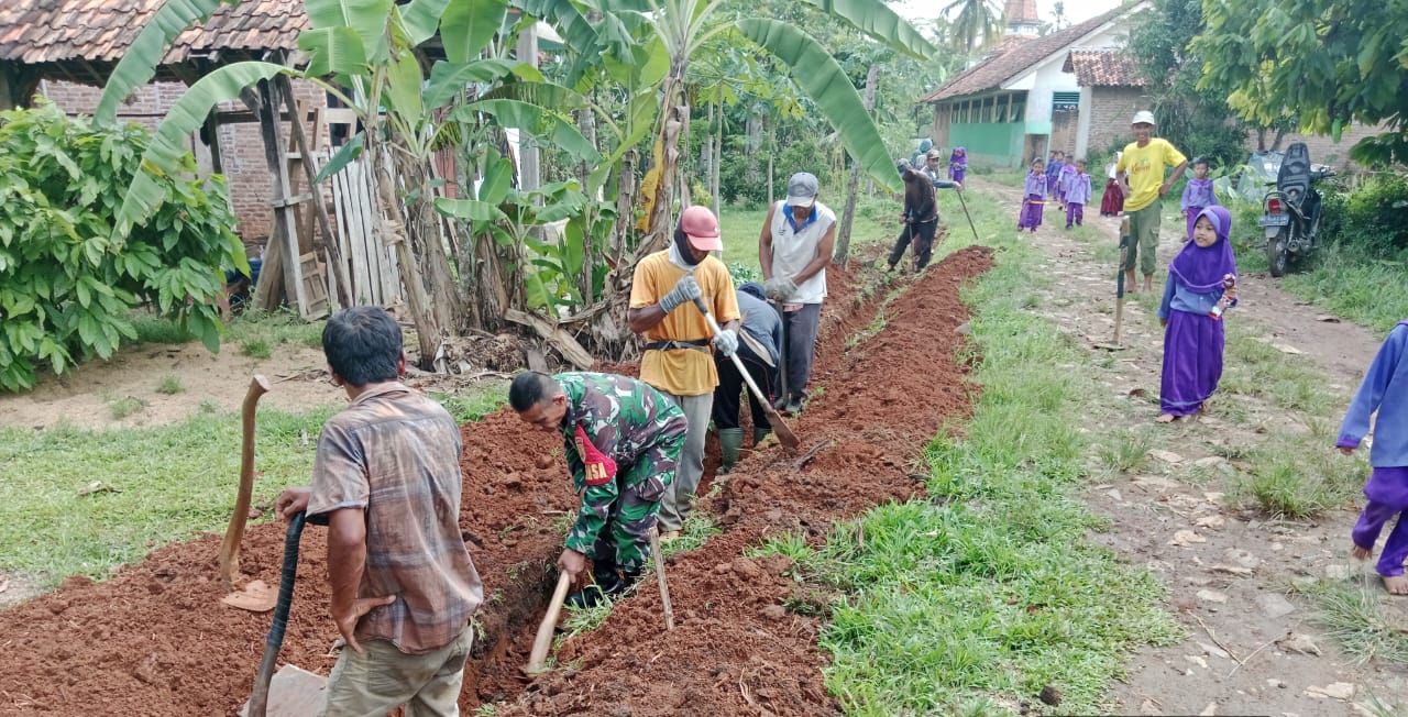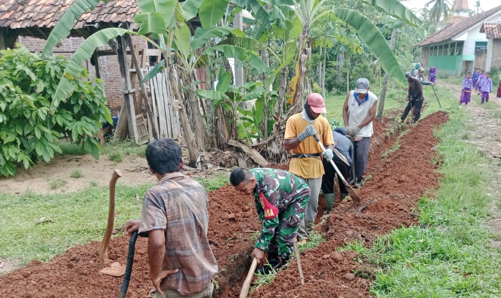 Bintara Pembina Desa (Babinsa) Koramil 424-09/Sukoharjo Serka Sugiyat bersama masyarakat gotong royong membuat saluran air (parit) di Pekon Bandung Baru, Kec. Adiluwih, Kab. Pringsewu, Selasa(07/01/2025).
