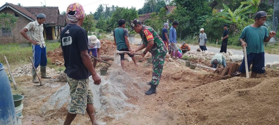 Babinsa Koramil 424-09/Sukoharjo Serd Suparman melaksanakan gotong royong bersama masyarakat pembuatan dan pengecoran drainase bertempat di Pekon Panggungrejo Kec. Sukoharjo, Kab. Pringsewu, Sabtu (11/02/2023).