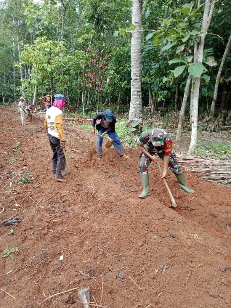 Babinsa Koramil 424-09/ Sukoharjo Gotong royong Merapikan Akses Jalan Menuju Perkebunan