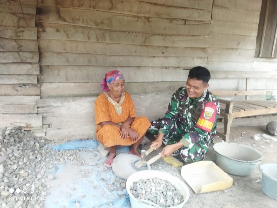 Babinsa Koramil 424-10/Pardasuka Serda Samsudin melaksanakan komunikasi sosial (komsos) dengan membantu warga memecahkan batu koral di Pekon Sinar Petir Kec. Bulok Kab. Tanggamus.,Minggu (08-01-2023).