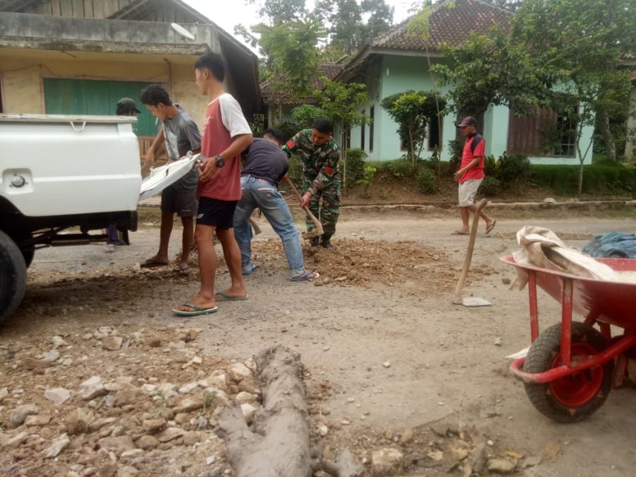 Babinsa Koramil 424-10/Pardasuka Praka Kholil gerakkan masyarakat untuk bergotong royong menimbun jalan yang rusak atau berlubang di Pekon Pematang Nebak Kec. Bulok Kab. Tanggamus.