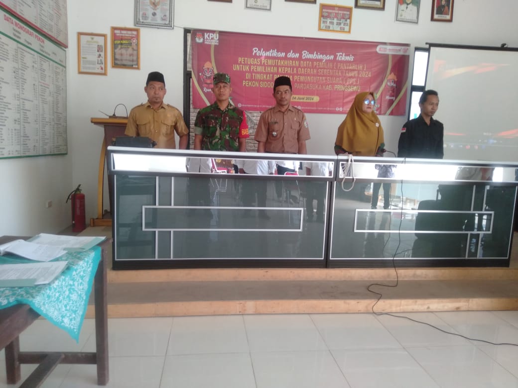 Babinsa Koramil 424-10/Pardasuka Sertu Nursalim menghadiri Pelantikan PPS dan Bimtek Pantarlih di Pekon Sidodadi & Pekon Pujodadi, Kecamatan Pardasuka, Kabupaten Pringsewu. Selasa (24/06/2024).