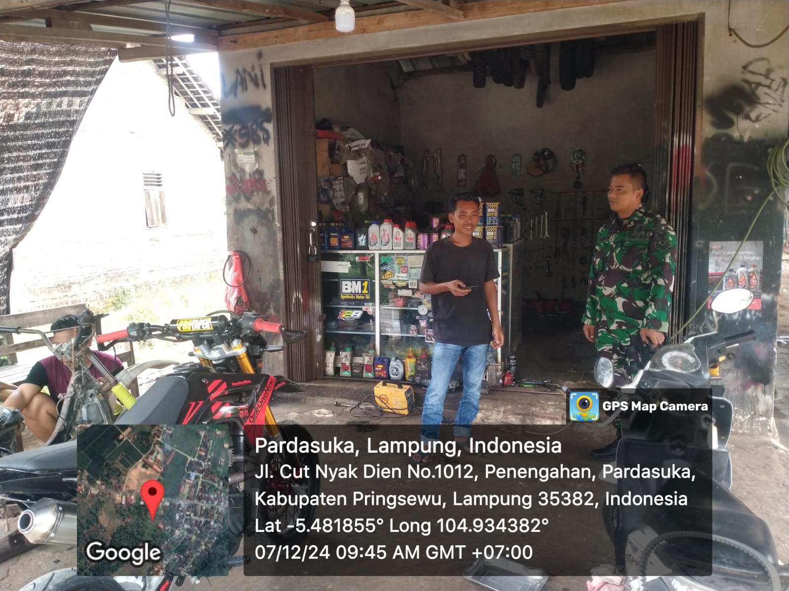 Babinsa Koramil 424 – 10/ Pardasuka, Sertu Mariyo melaksanakan anjangsana/ komsos dengan Bapak salah satu pemilik bengkel motor di Pekon Sidodadi, Kecamatan Pardasuka, Kabupaten Pringsewu, Sabtu (07/12/2024).