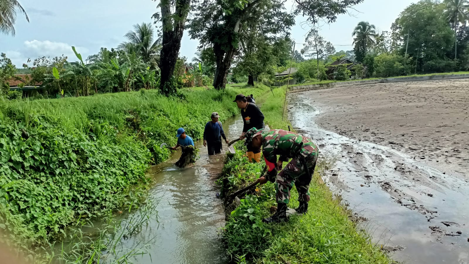 Serka Ruslan bersama masyarakat Desa binaan melaksanakan aksi bersih atau gotong-royong untuk membersihkan Aliran Air dari rumput liar dan sampah.