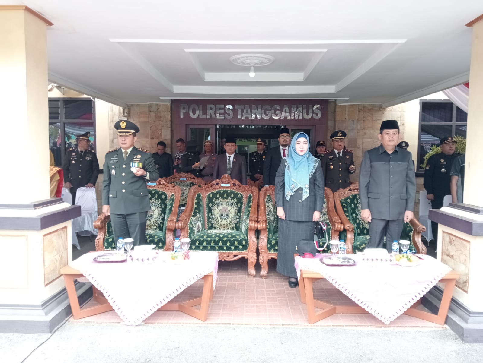 Dandim 0424/Tanggamus Letkol Inf Vicky Heru Harsanto. S.I.P., M.Si Beserta Ketua Persit KCK Cab XLVI Kodim 0424/Tanggamus Mengahadiri Upacara Peringatan HUT Bhayangkara Ke-77 Tahun 2023 di Polres Tanggamus.