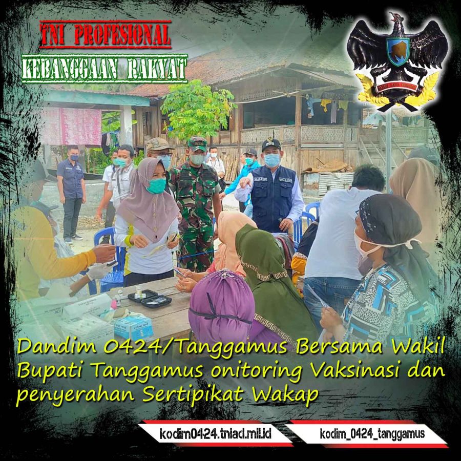Tanggamus – Dandim 0424/Tanggamus Letkol Arm Micha Arruan, SE., M.M Bersama Wakil Bupati Tanggamus Hi. AM. Syafi’i melaksanakan Monitoring Dalam Rangka Percepatan Vaksinasi Covid – 19 dan Pembagian Sertifikat Wakaf di Kabupaten Tanggamus. Kecamatan Cukuhbalak, Pulau Tabuan, Rabu (23/3/2022).