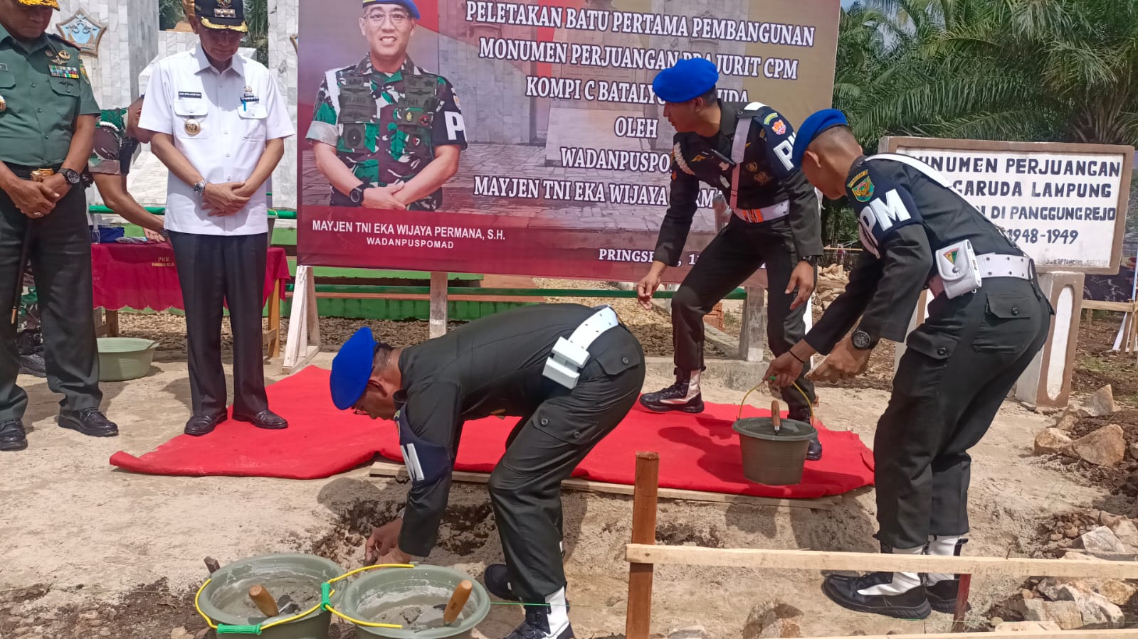 Dandim 0424/Tanggamus Letkol Inf Vicky Heru Harsanto, S.I.P.,M.Si menghadiri kegiatan peletakan batu pertama renovasi monumen perjuangan prajurit CPM Kompi C Batalyon Garuda oleh Wadan Puspomad Mayjen TNI Ekia Wijaya Permana, S.H bertempat di Pekon Panggungrejo Kecamatan Sukoharjo Kab. Pringsewu, Kamis (11/01/2024).