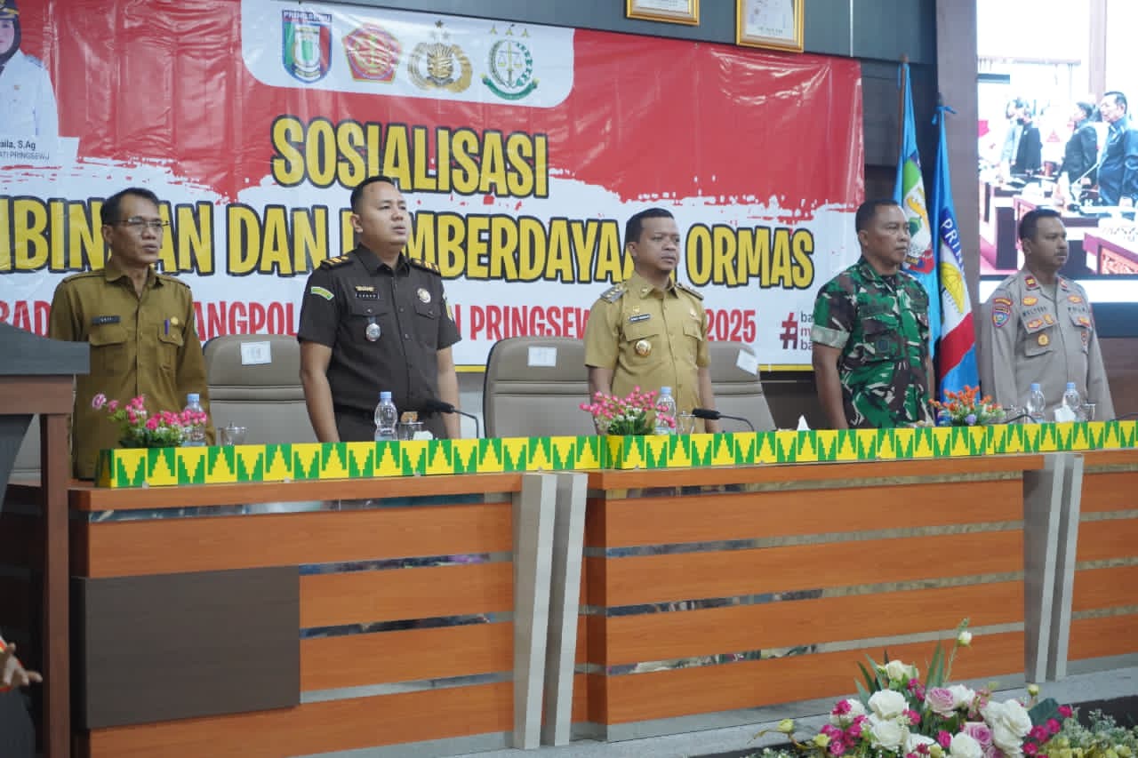Pringsewu – Dandim 0424/Tanggamus Letkol Inf Dwi Djunaidi Mulyono, S.E., M.I.P., yang diwakili Danramil 424-07/Gadingrejo Kapten Inf Redi Kurniawan menghadiri kegiatan Pembukaan Sosialisasi Pembinaan dan Pemberdayaan kepada Pengurus Organisasi Kemasyarakatan (Ormas), bertempat di Aula Bupati Pringsewu, Kabupaten Pringsewu, Selasa (25/11/2025).