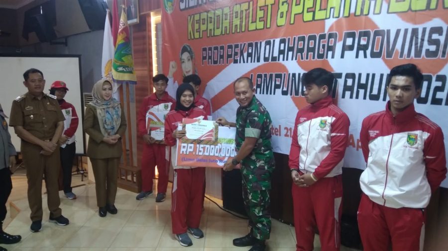 Dandim 0424/Tanggamus Letkol Inf Vicky Heru Harsanto, S.I.P., M.Si menghadiri Penyerahan Tali Asih/Bonus Kepada Atlet dan Pelatih Berprestasi Kabupaten Tanggamus Pada Pekan olahraga Provinsi (PORPROV) Lampung ke-IX Tahun 2022 bertempat di Aula Hotel 21 Gisting, Pekon Gisting Bawah Kec. Gisting Kab. Tanggamus. Selasa (18/23).