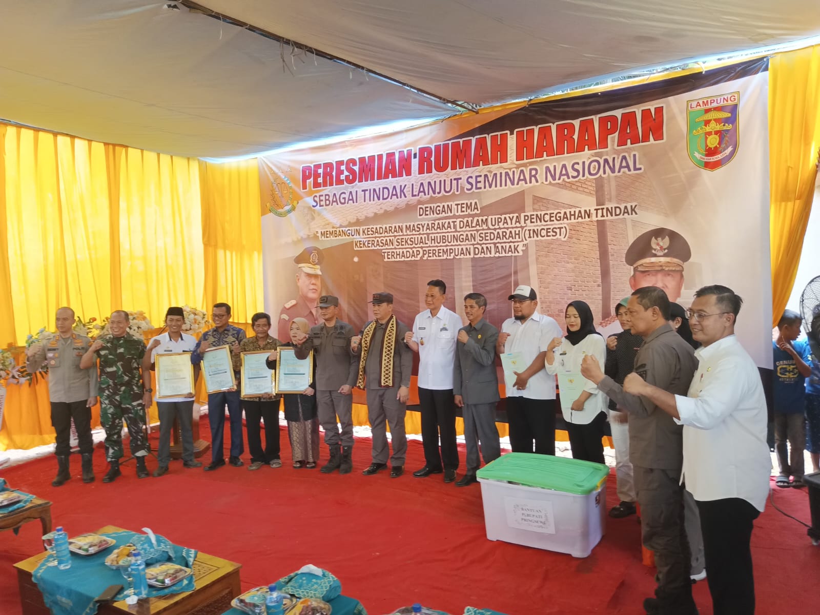 Dandim 0424/Tanggamus Letkol Inf Vicky Heru Harsanto. SIP,.M.Si menghadiri Peresmian dan Penyerahan Rumah Harapan dengan tema “Membangun kesadaran masyarakat dalam upaya pencegahan tindak kekerasan seksual hubungan sedarah ( Incest ) terhadap perempuan dan anak”, di Pekon fajar mulya, kec. pagelaran Utara. Rabu (11/10/2023).