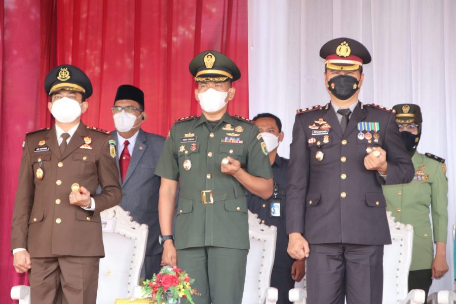 Pringsewu – Dandim 0424/Tanggamus Letkol Arm Micha Arruan, SE,. M.M menghadiri Puncak peringatan HUT ke-13 Kabupaten Pringsewu diperingati dalam satu upacara di lapangan pemkab Pringsewu, Minggu (3/4/22), dengan inspektur upacara Bupati Pringsewu Sujadi, perwira upacara Kapten Inf. Rahmad Kartolo dan komandan upacara Kapten Inf. Redi Kurniawan.