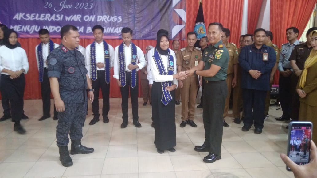 Dandim 0424/Tanggamus Letkol Inf Vicky Heru Harsanto. S.I.P,M.Si., yang di wakili Danramil 424-04/Talang Padang Kapten Inf Rio Antomi menghadiri Kegiatan Puncak Peringatan Hari Anti Narkotika Internasional (HANI) 2023 Kabupaten Tanggamus dengan tema “Akselerasi War On Drugs, Menuju Indonesia Bersinar ” bertempat di GSG Gisting Bawah, Pekon Gisting Bawah Kec. Gisting Kab. Tanggamus, Selasa (27-06-2023).