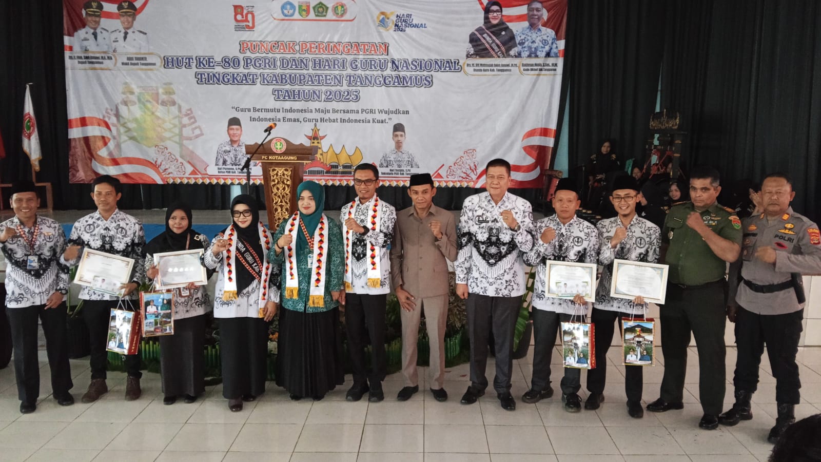 Peringatan HUT Ke-80 PGRI dan Hari Guru Nasional Tahun 2025 mengusung tema “Guru Bermutu Indonesia Maju, Bersama PGRI Wujudkan Indonesia Emas, Guru Hebat Indonesia Kuat” yang mencerminkan semangat untuk memperkuat peran guru sebagai pilar utama kemajuan pendidikan bangsa.Pasiops Kodim 0424/Tanggamus Kapten Inf M. Nizar menyampaikan bahwa peran guru sangat penting dalam membentuk generasi penerus bangsa yang berkualitas.