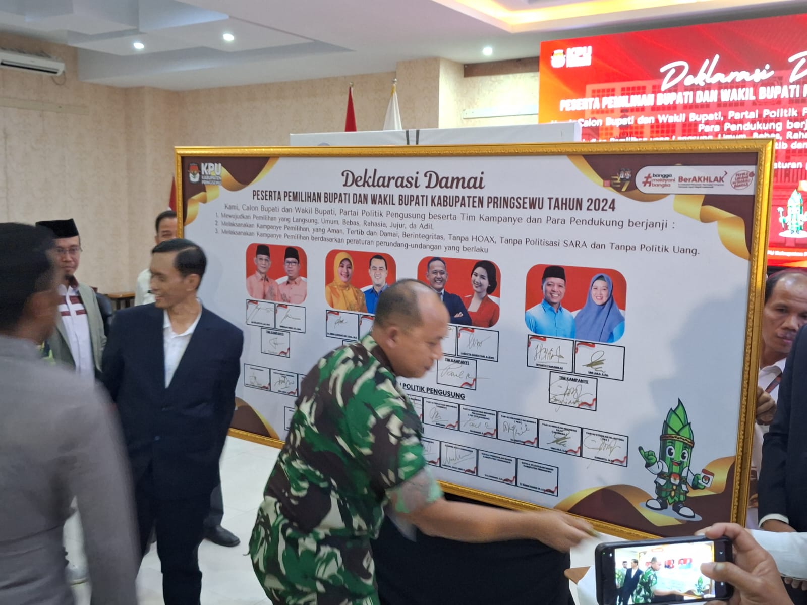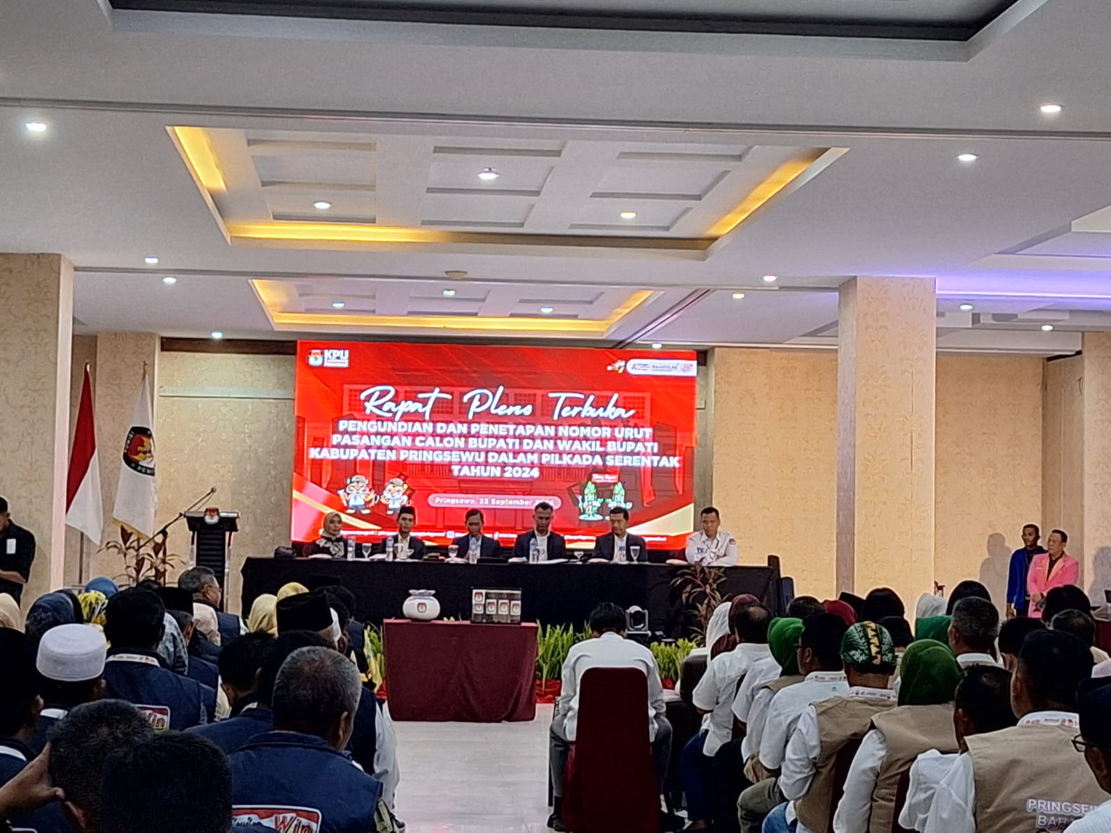 Dandim 0424/ Tanggamus, Letkol Inf Vicky Heru Harsanto S.I.P.,M.Si menghadiri Rapat Pleno Terbuka Pengundian dan Pengumuman Nomor Urut Pasangan Calon Peserta Pemilihan Bupati dan Wakil Bupati Pringsewu dan Deklarasi Kampanye Damai bertempat di Hotel Urban Pringsewu, Senin (23/9/24).Hadir pada kegiatan Rapat Pleno Terbuka Pengundian dan Pengumuman Nomor Urut Pasangan Calon Peserta Pemilihan Bupati dan Wakil Bupati Pringsewu dan Deklarasi Kampanye Damai Asisten 1 Ihsan Hendrawan, SH.,MH, Ketua KPU Kab. Pringsewu Sofyan Akbar Budiman, Ketua Bawaslu Suporandi, Kajari Pringsewu R. Wisnu Bagus Wicaksono, S.H.,M.Hum, Ketua DPRD Pringsewu Suherman, SE, Para Pimpinan DPD Partai Politik Pendukung dan Pengusung Paslon serta Tamu Undangan.Rapat pleno yang dipimpin langsung oleh Ketua KPU Pringsewu, Sofyan Akbar Budiman bersama para komisioner KPU Pringsewu tersebut berlangsung aman.Usai keempat calon bupati dan wakil bupati mendapatkan undian nomor urut, KPU menandatangani dan membacakan berita acara penetapan.Dari hasil pengundian pasangan Fauzi dan Laras Tri Handayan mendapat nomor urut satu, nomor urut dua pasangan Adi Erlansah dan Hizbullah Huda, nomor urut tiga pasangan Rianto Pamungkas dan Umi Laila, serta nomor urut empat pasangan Ririn Kuswantari-Wiriawan Sada.Dalam kesempatan tersebut, Dandim 0424/tanggamus menegaskan bahwa tugas pengawasan dalam pemilihan merupakan tanggung jawab yang mulia. Ia berkomitmen untuk mengawal dan mendukung pengamanan bersama Polri dan instansi terkait lainnya dalam rangka menciptakan suasana pemilihan yang aman, damai, dan tertib.harapannya agar seluruh pihak berperan aktif dalam menjaga situasi kondusif menjelang Pemilihan Serentak. Pelaksanaan kegiatan ini menunjukkan keseriusan semua pihak dalam mewujudkan pesta demokrasi yang aman dan damai.Pungkasnya.
