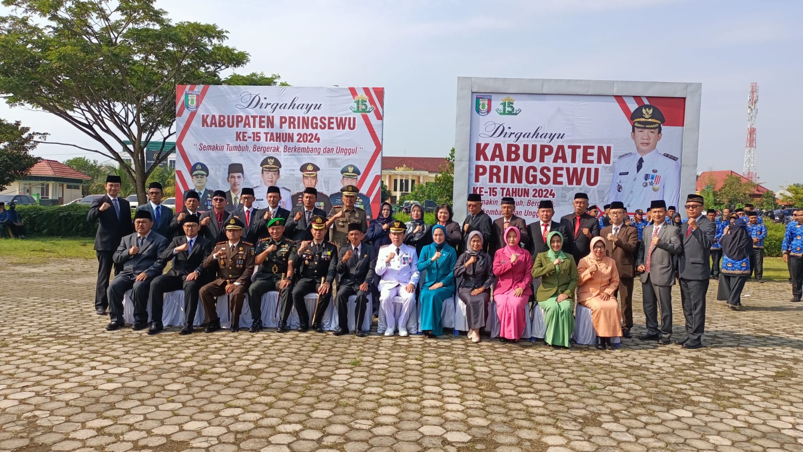 Dandim 0424/Tanggamus Letkol Inf Vicky Heru Harsanto.S.I.P.,M.Si beserta ketua Persit KCK Cab.XlVI Ny. Lia Vicky Heru harsanto mengikuti Upacara Hari Ulang Tahun Kab. Pringsewu Ke -15 Tahun 2024 di Lapangan Pemda Pringsewu. Rabu (3/4/24).
