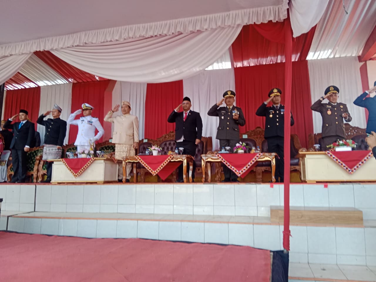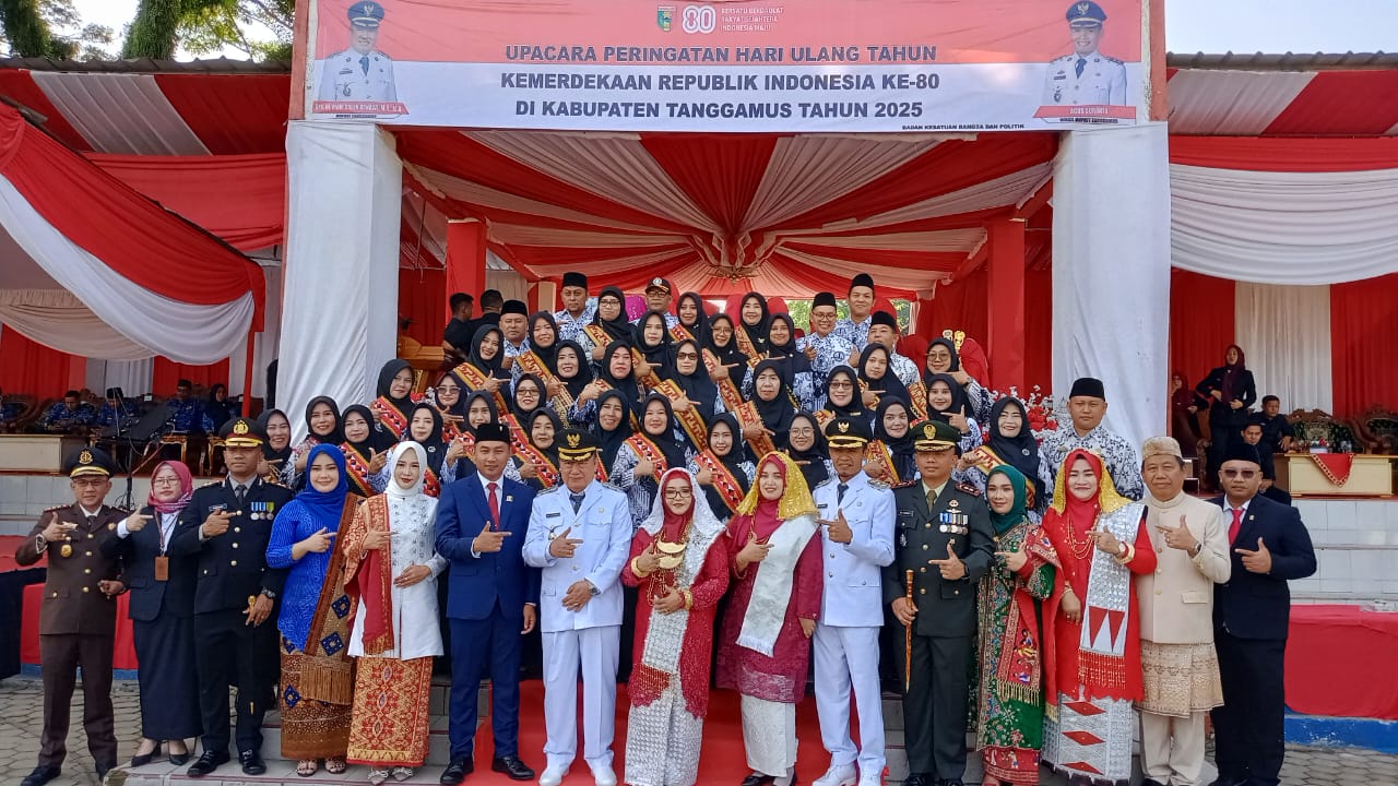 Dandim 0424/Tanggamus Letkol Inf Dwi Djunaidi Mulyono S.E.,M.I.P., di dampingi Ketua Persit KCK Cabang XLVI Dim 0424 Ny Tika Dwi Djunaidi bersama Forkopimda Kabupaten Tanggamus mengikuti upacara peringatan detik-detik Proklamasi Kemerdekaan Republik Indonesia ke-80 dan pengibaran sang merah putih yang dipimpin langsung oleh Bupati Tanggamus Drs. Hi Muhammad Saleh Asnawi, bertempat di Lapangan Merdeka Pekon Kuripan, Kec. Kota agung, Kab. Tanggamus, Minggu (17/08/2025).