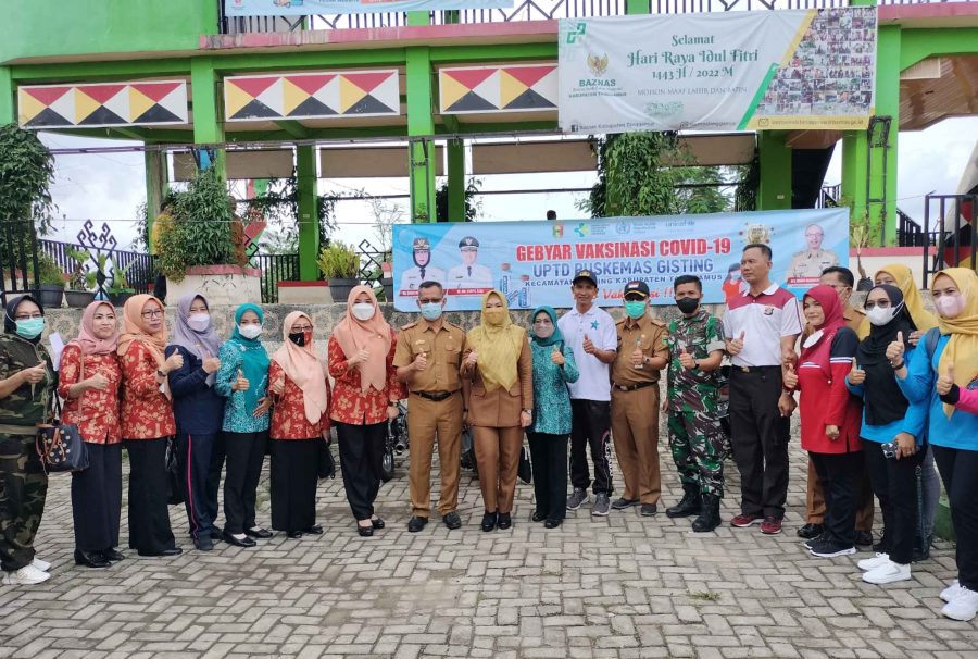Hadir dalam kegiatan tersebut Ketua DWP Ny. Nur’aini Hamid Lubis, Asisten II Bid Ekonomi dan pembangunan Sukisno, SKM. M.Kes, Kadis kesehatan Taufik Hidayat, Danramil 424-04 Kapten Inf Juliani Abri, Kapolsek Talang Padang AKP Sarwani, Camat Gisting Purwanti, Sp.SS.Psi, KUPT Puskesmas Gisting Beny Heranista, Am.Keb, Para Kepala Pekon seKecamatan Gisting, Tim Vaksinator dari UPT Puskesmas Gisting dan Masyarakat peserta Vaksinasi.MC 424