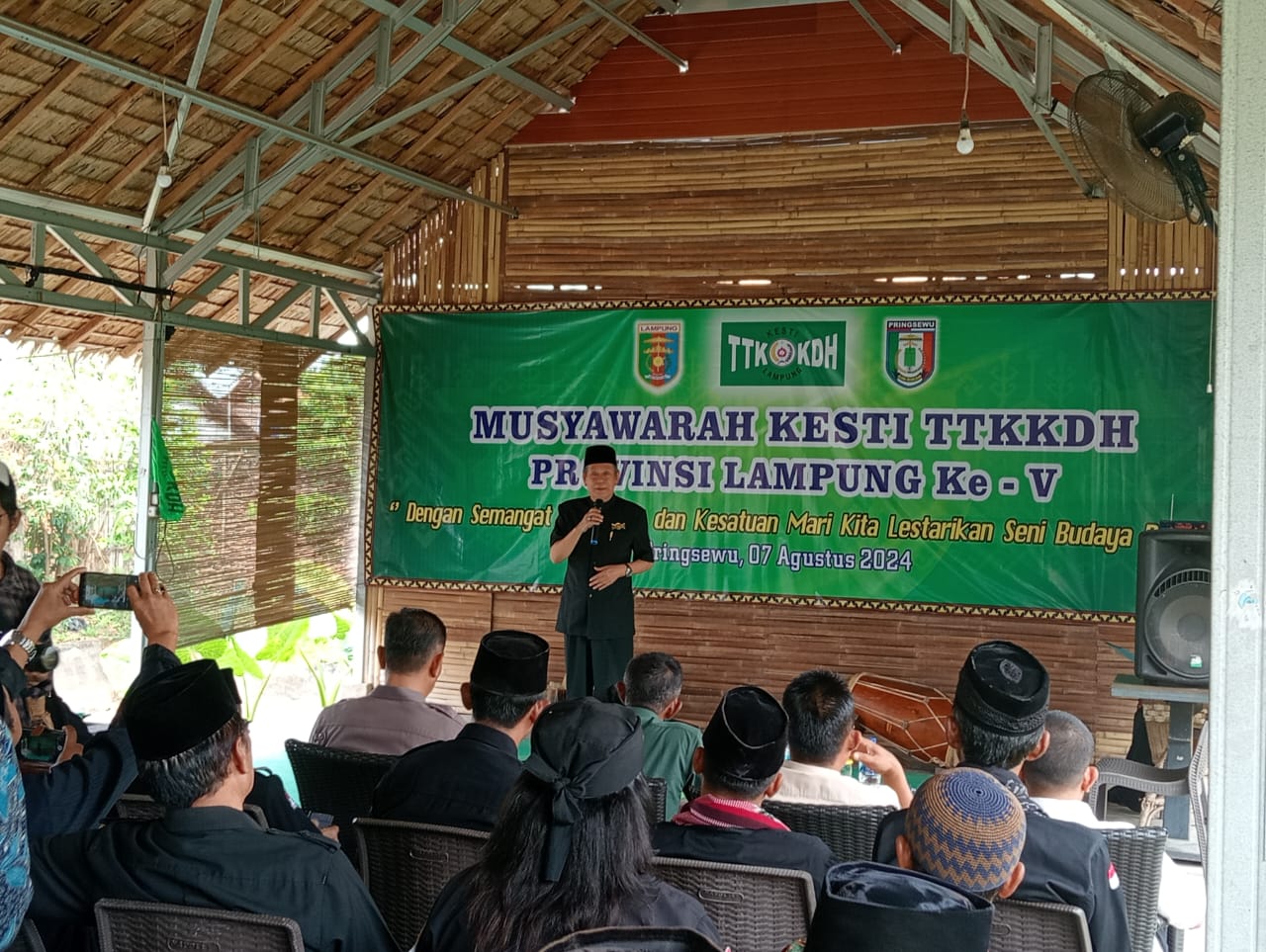 Hadir dalam kegiatan Kaban Kesbangpol Sukarman, S.Pd, Wakapolsek Pringsewu Kota Akp Darwin, Kadis BPBD Pringsewu Drs. Nang Abidin Hasan, Kabid Kebudayaan Disdikbud Sigit Budiarto, S.Pd, Kasi kerjasama Pol PP Elfa Yuli, S.IP, Ketua Umum TTKKDH Lampung Drs. Risman Hamid, M.M, Ketua DPC TTKKDH Pringsewu Ahmad Muslim Matehek, Pengurus Gubuk Sholawat ( K.R Arif Al-Mubarok, Para pengurus DPW, DPC TTKKDH Se-Prov. Lampung, Para Anggota TTKKDH.Sambutan Pj. Bupati Pringsewu, yang disampaikan oleh Kaban Kesbangpol menyampaikan Kesti TTKKDH sebagai salah satu Rumah Besar Kesenian Tari dan Silat Tjimande Tari Kolot Kebon Djeruk Hilir yang telah ada sejak Tahun 1770 (abad XVIII) adalah organisasi yang telah tumbuh dan berkembang sebagai bagian dari budaya warga masyarakat kita.