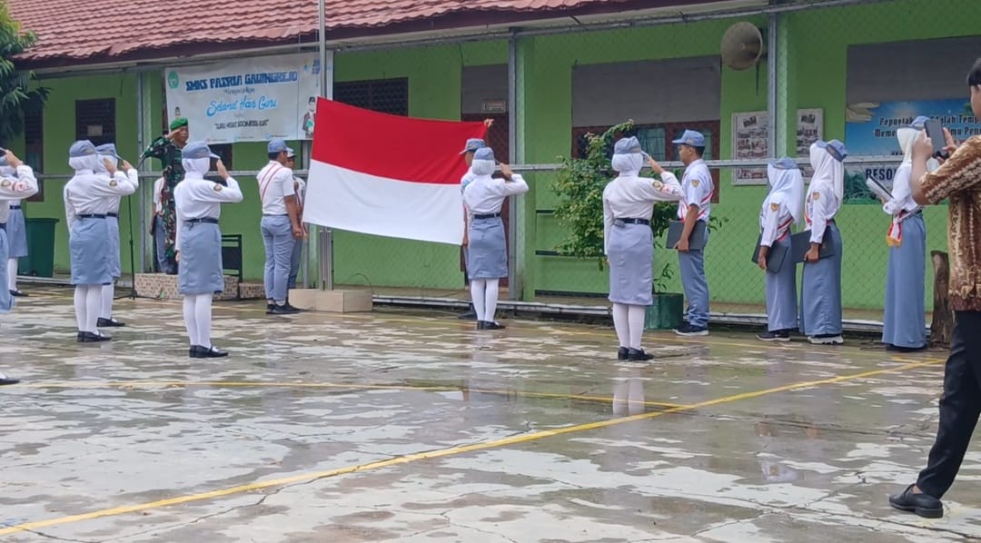 Pringsewu – Danramil 424-07/Gadingrejo Kapten Inf Redi Kurniawan beserta tiga orang anggota mengikuti sekaligus menjadi pembina upacara bendera di SMK Patria Gadingrejo, Kecamatan Gadingrejo, Kabupaten Pringsewu, Senin (09/02/2026).