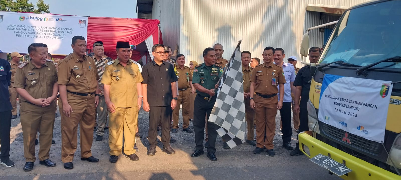 Danramil 424- 08/Pulau Panggung Letda Inf Masirun menghadiri kegiatan Launching penyaluran CPP pemberian bantuan pangan periode bulan juni – juli 2025, betempat di gudang bulog Pekon Rantau Tijang Kec. Pugung, Kab. Tanggamus, Senin (21/07/2025).
