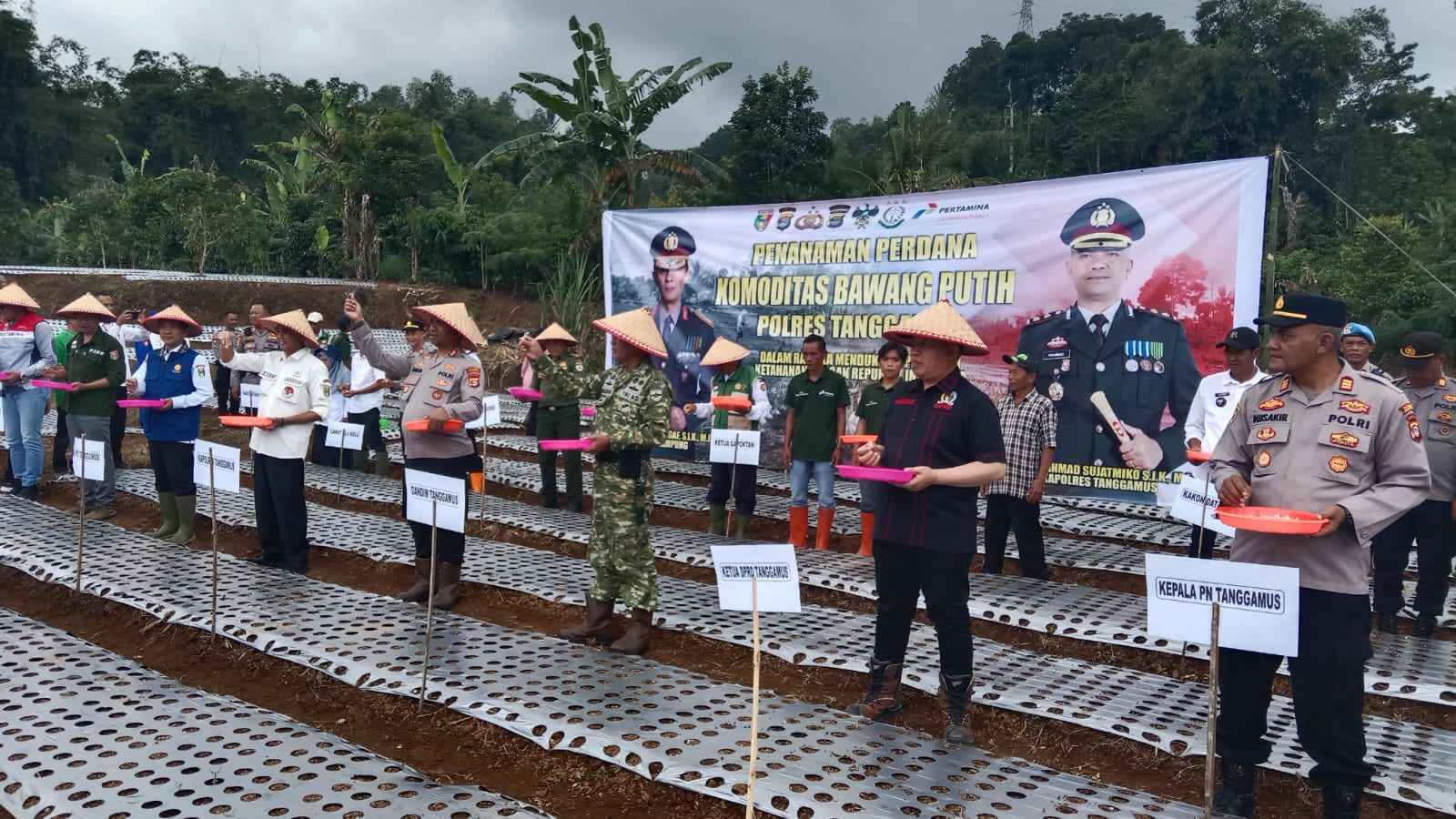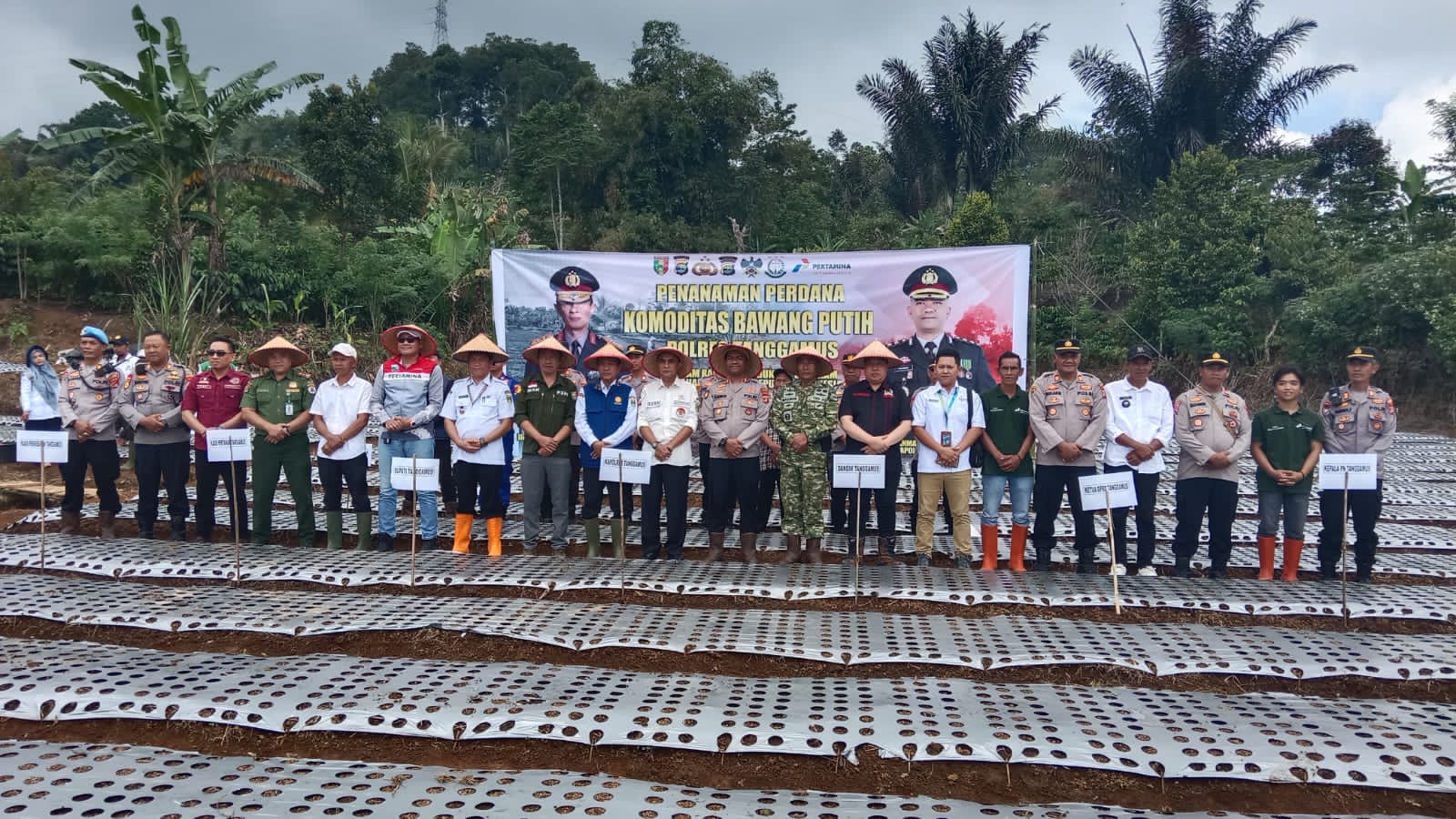 Tanggamus – Danramil 424-08/Pulau Panggung, Lettu Inf Masirun, menghadiri kegiatan launching penanaman perdana komoditas bawang putih yang diselenggarakan oleh Polres Tanggamus di Pekon Datarajan, Kecamatan Ulubelu, Kabupaten Tanggamus, Rabu (15/04/2026).